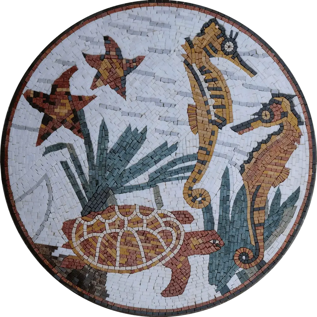 Discover the stunning beauty of our Mosaic Tile Art - The Mermaid Turtle, a captivating luxury stone artwork that elegantly merges the grace of marine life with exquisite handcrafted artistry. This premium quality mosaic features a mesmerizing depiction of a mermaid gracefully perched atop a majestic turtle, set against a serene neutral backdrop that enhances its radiant charm. Each element is meticulously crafted from exotic natural stone, carefully selected for its texture and color to create a harmonious and dazzling composition that tells a story of oceanic wonder. The mosaic’s palette is enriched by the luminous and crystalline brilliance of Prisma Yellow Quartz and Dark Red Quartz, whose jewel-like warmth adds depth and vibrancy. Complementing these, the shimmering and prismatic hues of Dark Blue Quartz, Prisma Blue Quartz, and Aqua Blue Quartz evoke the ocean’s scintillating depths with their translucent and radiant quality. Accents of Light Purple Quartz and Dark Purple Quartz contribute a silky, cool-to-the-touch dimension, imbuing the piece with an enchanting, sophisticated allure. These rare, exotic materials elevate the mosaic’s overall aesthetic, making it a true masterpiece of natural stone craftsmanship. Perfect for individual expression and refined sophistication, this mosaic art piece serves as a statement décor item that elevates any living space. Whether adorning your living room, enhancing your dining area, or adding a touch of elegance to your bathroom, The Mermaid Turtle mosaic blends effortlessly with coastal, bohemian, modern, or minimalist interiors. Beyond decoration, it invites reflection on the beauty of nature and oceanic harmony, making it an ideal gift for art lovers and ocean enthusiasts alike. Elevate your home with this timeless, handcrafted mosaic and let its captivating artistry inspire your imagination and enhance your living environment.