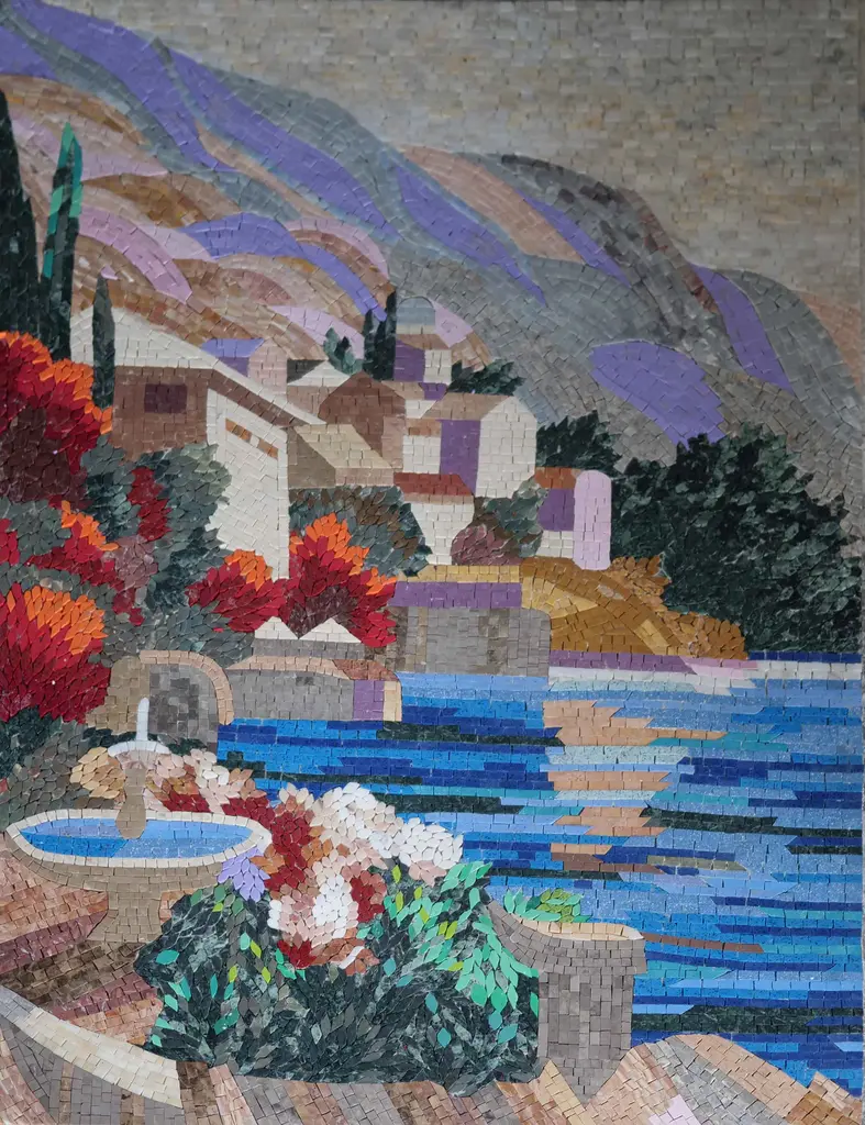 Transform your living space into a vibrant coastal retreat with our Mosaic Wall Art - Colorful Coastal City. This stunning, handcrafted piece captures the essence of seaside charm, featuring an array of rustic houses nestled along the shore, their picturesque facades set against the serene backdrop of majestic mountains. Expertly crafted from premium quality marble mosaics, this artwork not only dazzles with its intricate design but also offers lasting durability, ideal for both interior and exterior décor. Whether displayed in your living room, entryway, or patio, it effortlessly elevates your space with a sense of coastal tranquility and refined elegance. Enriched with exotic materials, this mosaic showcases a captivating palette that includes the vibrant Blue Macaubas quartzite, known for its stunning cerulean veining and electric blue radiance, adding sapphire-like depth and sophistication. The luminous, crystalline beauty of Dark Red Quartz and the prismatic, shimmering Aqua Blue and Prisma Blue Quartz stones lend radiant, jewel-like brilliance to the composition. Delicate touches of Light Purple Quartz introduce a scintillating, translucent brilliance that enchants the eye and enhances the mosaic’s luxurious feel. Crafted to inspire, this piece evokes the warmth of sunny seaside escapades and vacation vibes, making it a conversation starter and a bold expression of artistry. Perfect for lovers of coastal lifestyles or those seeking to infuse whimsy and luxury into their décor, it harmonizes seamlessly with styles from modern to rustic. More than decoration, the Mosaic Wall Art - Colorful Coastal City is a slice of coastal paradise, transforming your home into a haven of beauty and inspiration. Don’t miss the chance to own this exquisite work of art that captures the spirit of ocean-side living.