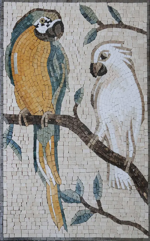 Introducing our stunning Mosaic Wall Art - Macaw and White Parrot, a unique and captivating piece that will transform your space into a vibrant oasis. Crafted with care, this exceptional wall art is composed of all-natural stones and decorative tiles, ensuring that you receive a product of the finest quality. The intricate design showcases two magnificent parrots perched gracefully on a tree limb: the vivid blue-yellow Macaw, known for its striking coloration and playful spirit, alongside the elegant White-bellied Parrot, celebrated for its serene beauty. The combination of these two avian species brings a tropical charm to any environment, making it a perfect statement piece for both indoor and outdoor settings.Whether you are looking to enhance your home décor, liven up your garden, or create a welcoming atmosphere in your commercial space, this Mosaic Wall Art - Macaw and White Parrot is sure to impress your guests and visitors alike. Its intricate details and vivid colors create a sense of joy and tranquility, capturing the essence of nature right in your living space.Create a conversation starter in your home with this striking mosaic masterpiece. Perfect for bird lovers and art enthusiasts, our Mosaic Wall Art will not only add beauty to your surroundings but also serve as a testament to the craftsmanship that goes into each piece. Don't miss the opportunity to bring a touch of the exotic into your life. Elevate your décor with the enchanting Mosaic Wall Art - Macaw and White Parrot today!