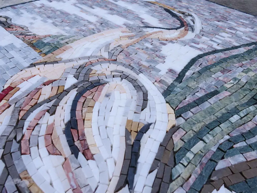 The majestic heron is a mosaic wall art with a heron on the side of a river. Using neutral tones this mosaic artwork is fully handmade from marble stones designed for both walls and floors.