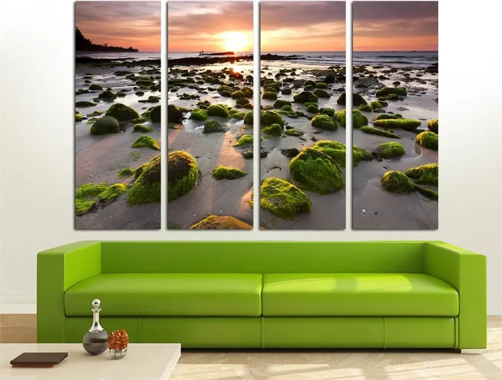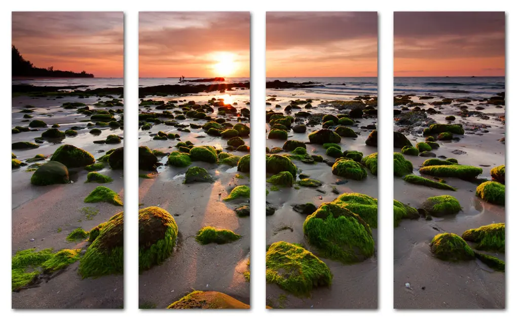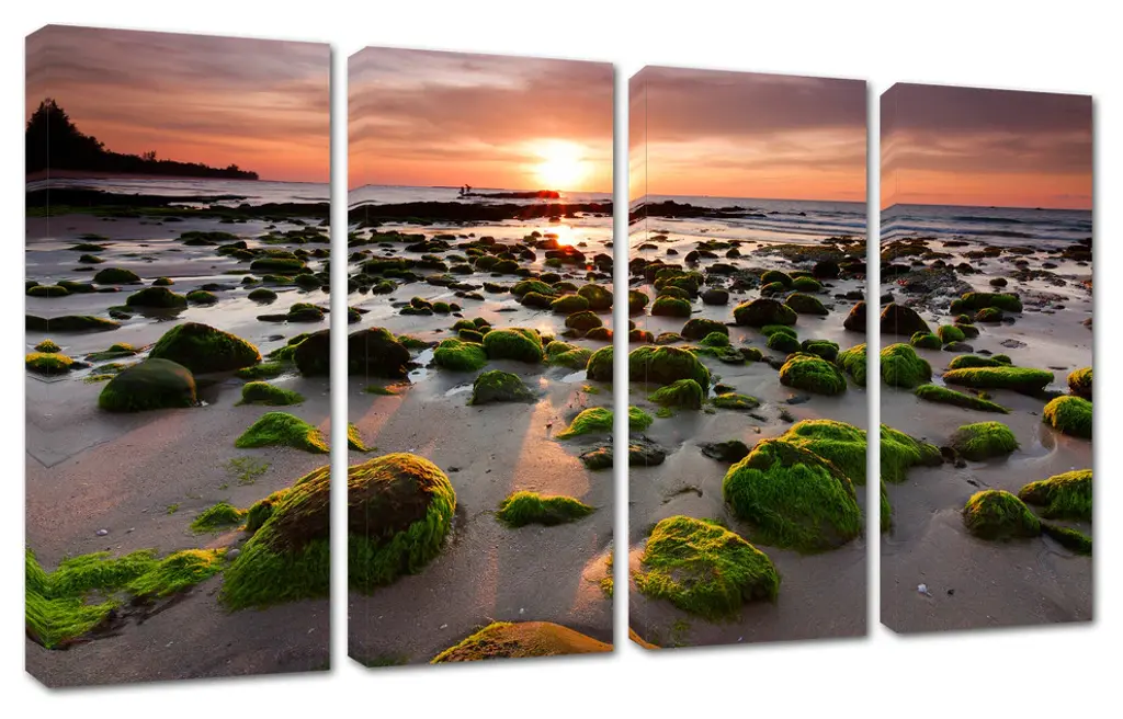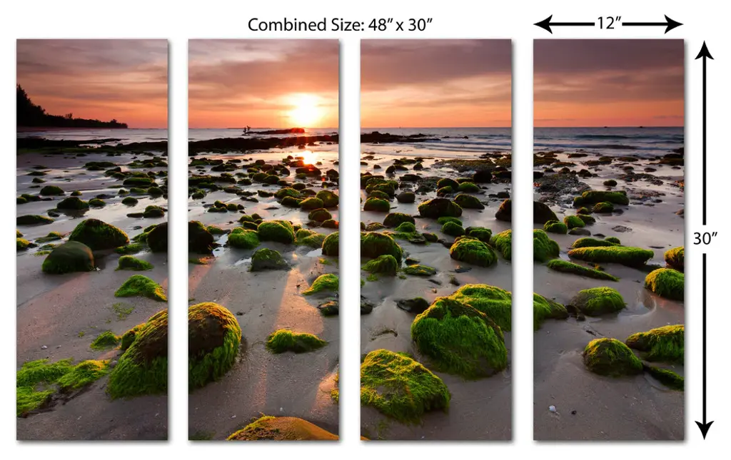 48"œ x 30"œ total size. Ready To Hang! (4 pieces - 12"œ x 30"œ each). 4 Panel Split canvas print. Features Mossy rocks at a beach in Kudat, Sabah, East Malaysia. Giclee print for home, living room or office wall decor & interior design.. OBA free Giclée print wall art. Gallery Wrap - Image wraps around sides of the stretcher bars. Can be hanged without any decorative frames. • Canvas Giclee Wall Art• Made in USA• Ready to hang• Sawtooth hangers on the back• Hand stretched on 1.5"œ wooden stretcher bars• Fade resistant, OBA free canvas• 350gsm, 18mil poly/cotton canvas• UV-protective coating• Gallery Wraped with mirrored edges• Epson printing process• For indoor use