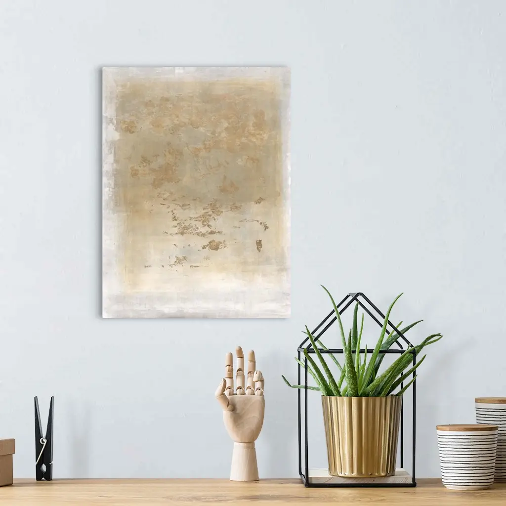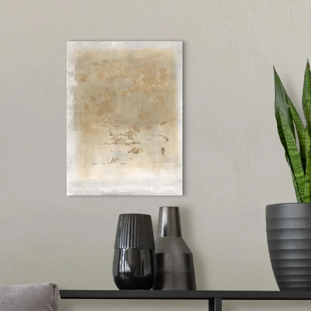 Soft abstract painting with a white boarder and a faint gold rectangle in the center with darker gold blotches on top.