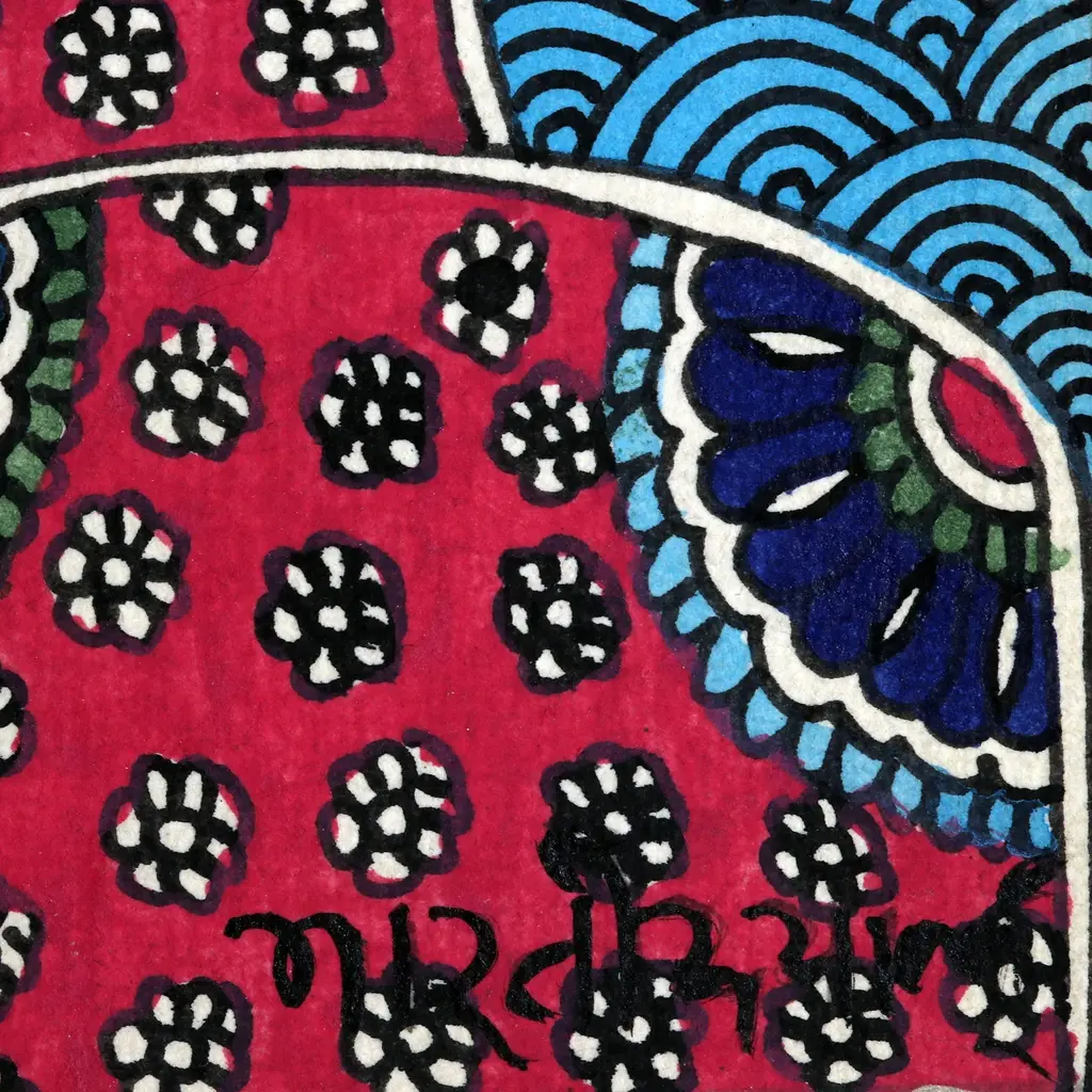 India's Bharti Dayal demonstrates a mother's unconditional love for her child in the this charming folk painting. The artist uses brushes, sharpened reeds, and pen nibs with acrylic on handmade paper to create the stylized appearance of the two figures and the swirling bird and flower designs that surround them.