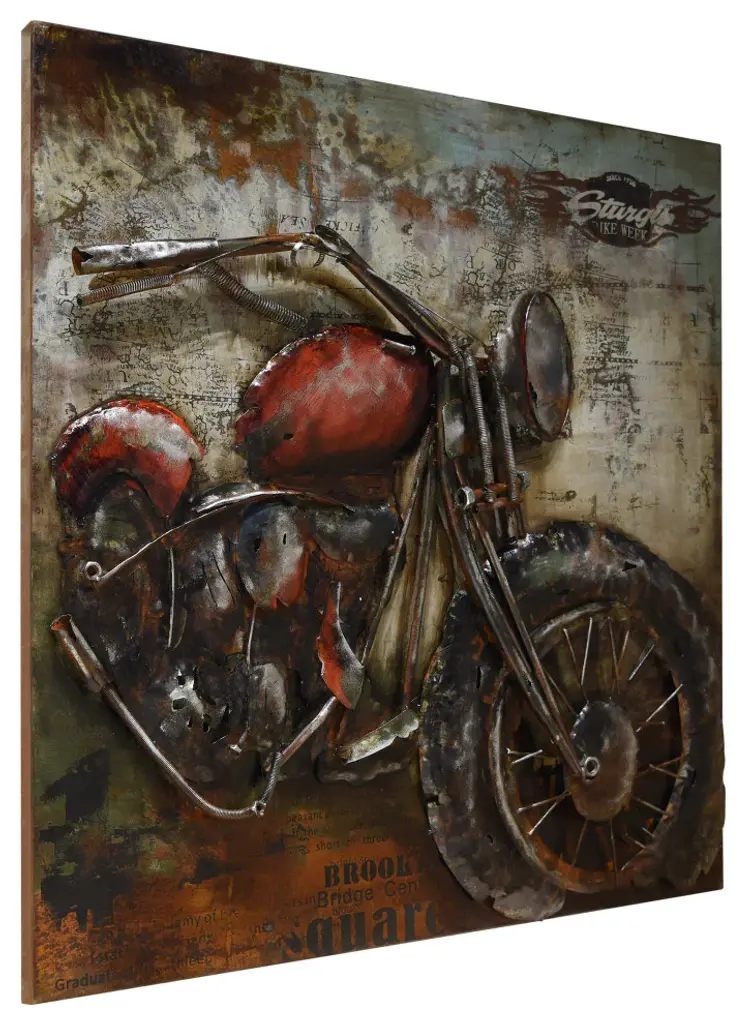 Diptych Set - 40" x 3.5" x 40" each. This tough old motorcycle is a perfect fit for iron sculpture work, giving immediate depth and texture to the subject while representing its metallic nature. The Harley is a stylized metal sculpture of the classic bike superimposed on a timeless map with a Sturgis Bike Week logo. Great for any enthusiast.
