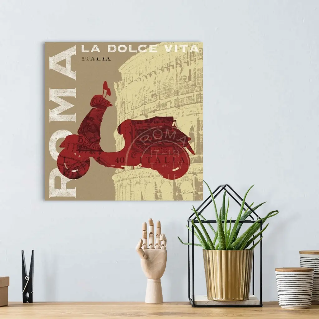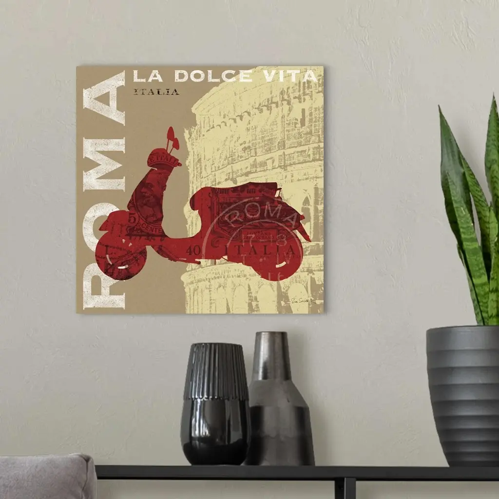 Retro artwork of a red Vespa printed over the famous coliseum in Italy. "ROMA" is printed in bold white text going vertically on the print.