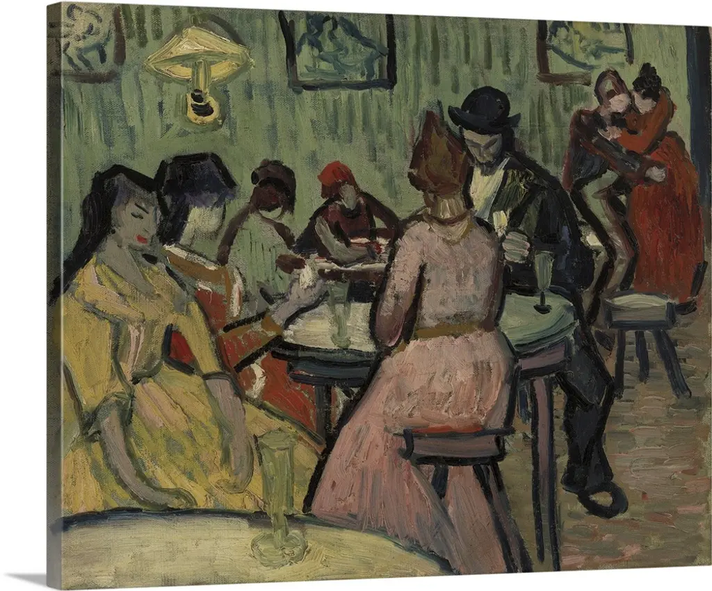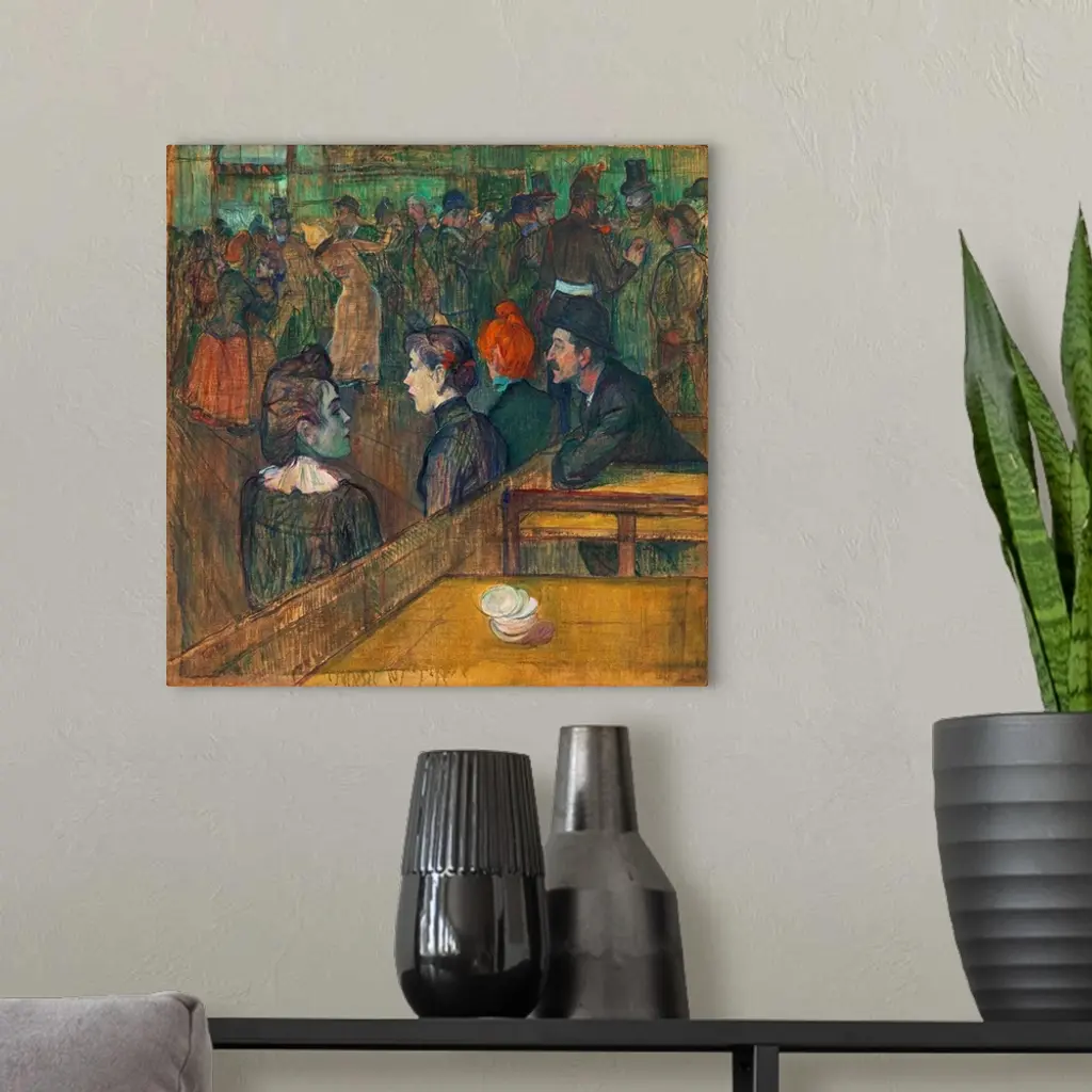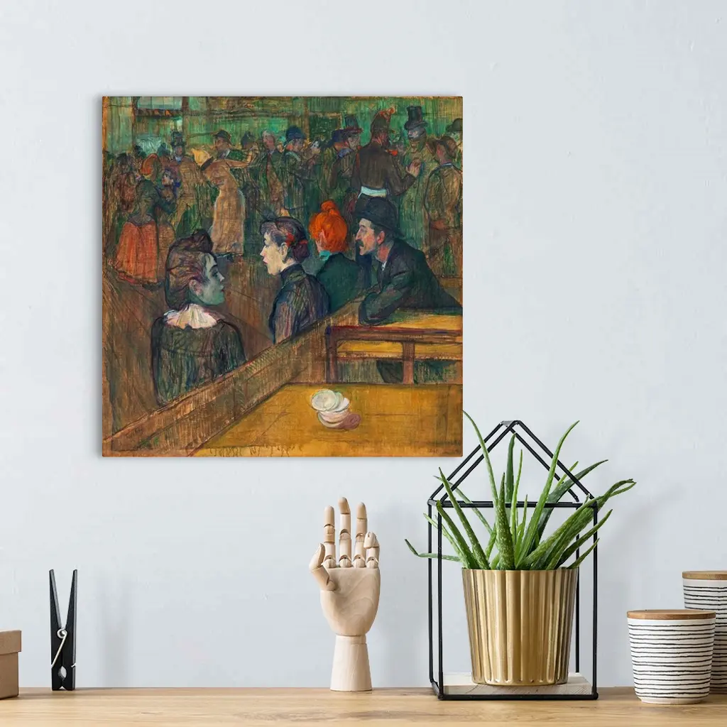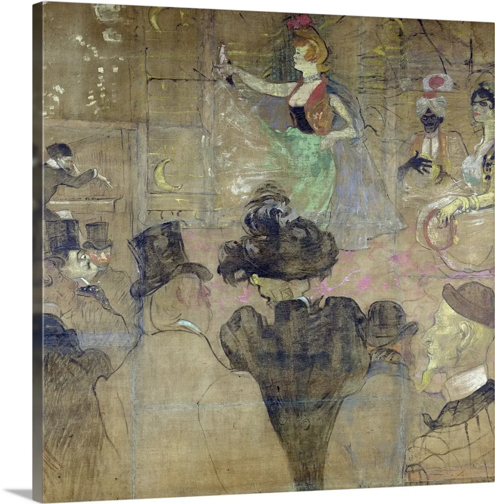 With this painting of the dance hall known as the Moulin de la Galette, Henri de Toulouse-Lautrec established his reputation as the painter-chronicler of the entertainments of Montmartre. In this well-known image, Lautrec employed the wood barrier as a metaphorical divide between the frenzied action of the dance hall, seen as a blur in the background, and the stillness of the bored and waiting women (accompanied by a proprietary male) in the foreground. He used turpentine to thin his paint and applied it in loose washes, a technique known as peinture a l'essence. The result is a seemingly unfinished look that suggests both the immediacy of the artist's observations and the dinginess of his subject.