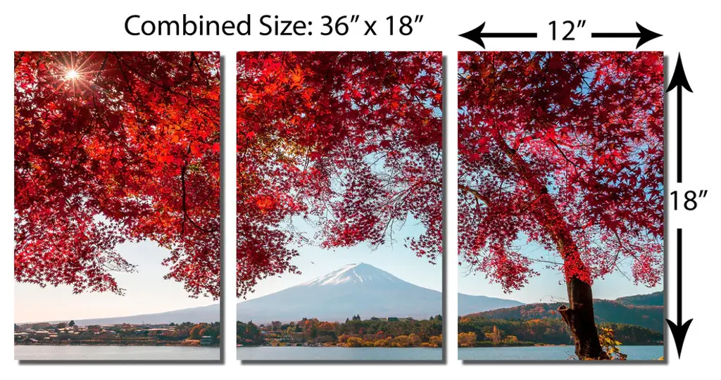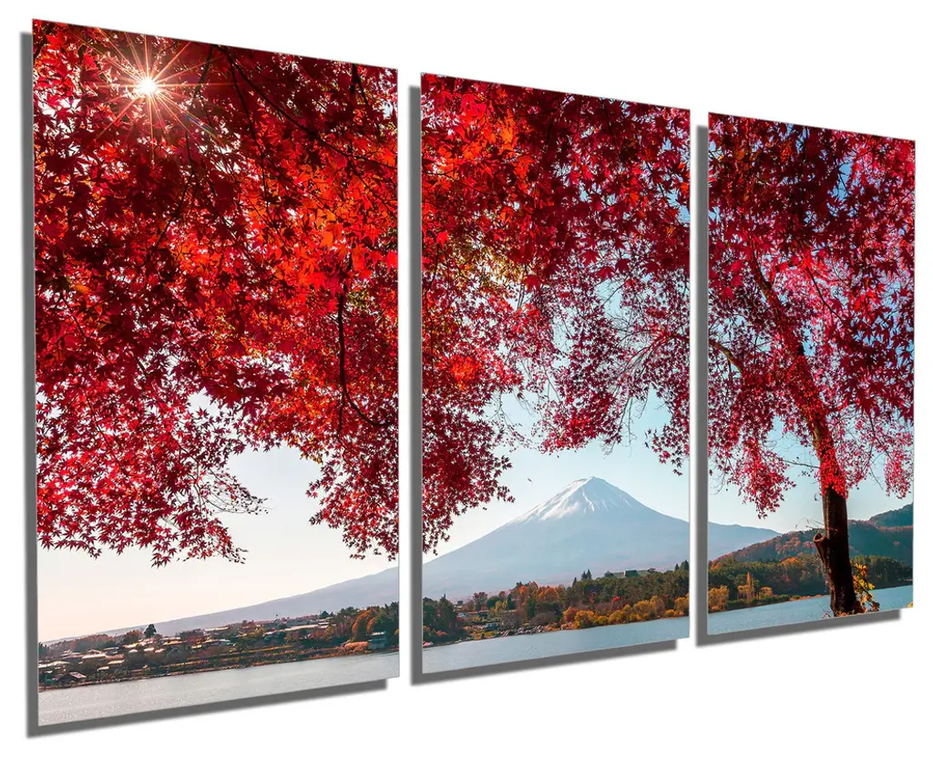 36" x 18" total size. Ready To Hang! (3 pieces - 12" x 18" each). 3 Panel Split, Triptych Metal Print of Mount Fuji, Japan in autumn, behind maple tree with red leaves. Modern metal wall art for home or office wall decor. Printed on Luxurious, HD aluminum glossy metal panels. Multi panel art.. HD aluminum panels. Metal print wall art. Includes Shadow Wall Mount on the back.• Aluminum Metal Wall Art• Made in USA• Ready to hang - No assembly required• Shadow mount hardware on the back• 0.045" thick HD Aluminum Panels• Scratch resistant, glossy finish• Superb color clarity, luxurious prints• Epson printing process• For indoor or moisture rich environment use• Easy to clean. Gently wipe with microfiber cloth.