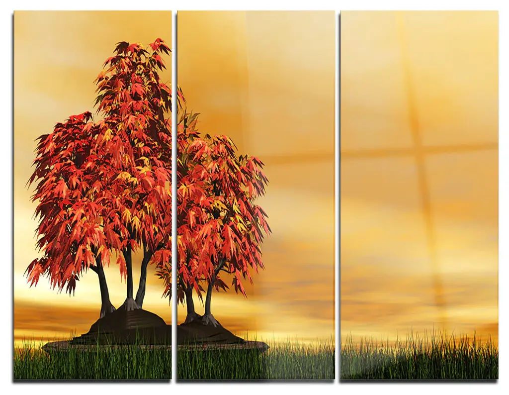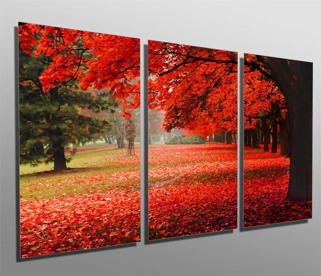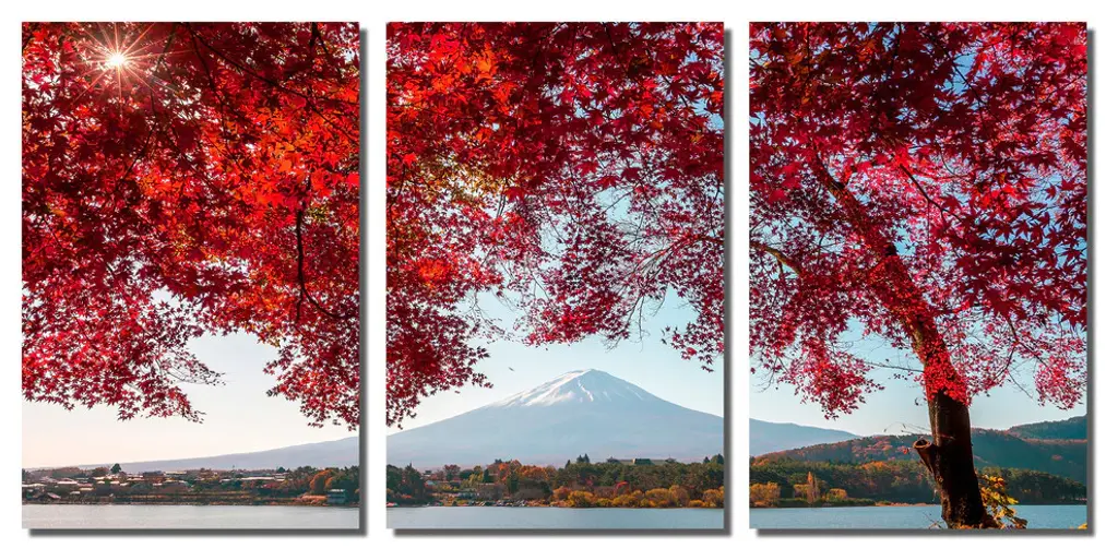 48" x 24" total size. Ready To Hang! (3 pieces - 16" x 24" each). 3 Panel Split, Triptych Metal Print of Mount Fuji, Japan in autumn, behind maple tree with red leaves. Modern metal wall art for home or office wall decor. Printed on Luxurious, HD aluminum glossy metal panels. Multi panel art.. HD aluminum panels. Metal print wall art. Includes Shadow Wall Mount on the back.• Aluminum Metal Wall Art• Made in USA• Ready to hang - No assembly required• Shadow mount hardware on the back• 0.045" thick HD Aluminum Panels• Scratch resistant, glossy finish• Superb color clarity, luxurious prints• Epson printing process• For indoor or moisture rich environment use• Easy to clean. Gently wipe with microfiber cloth.