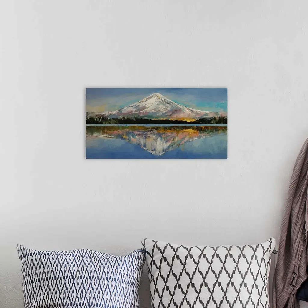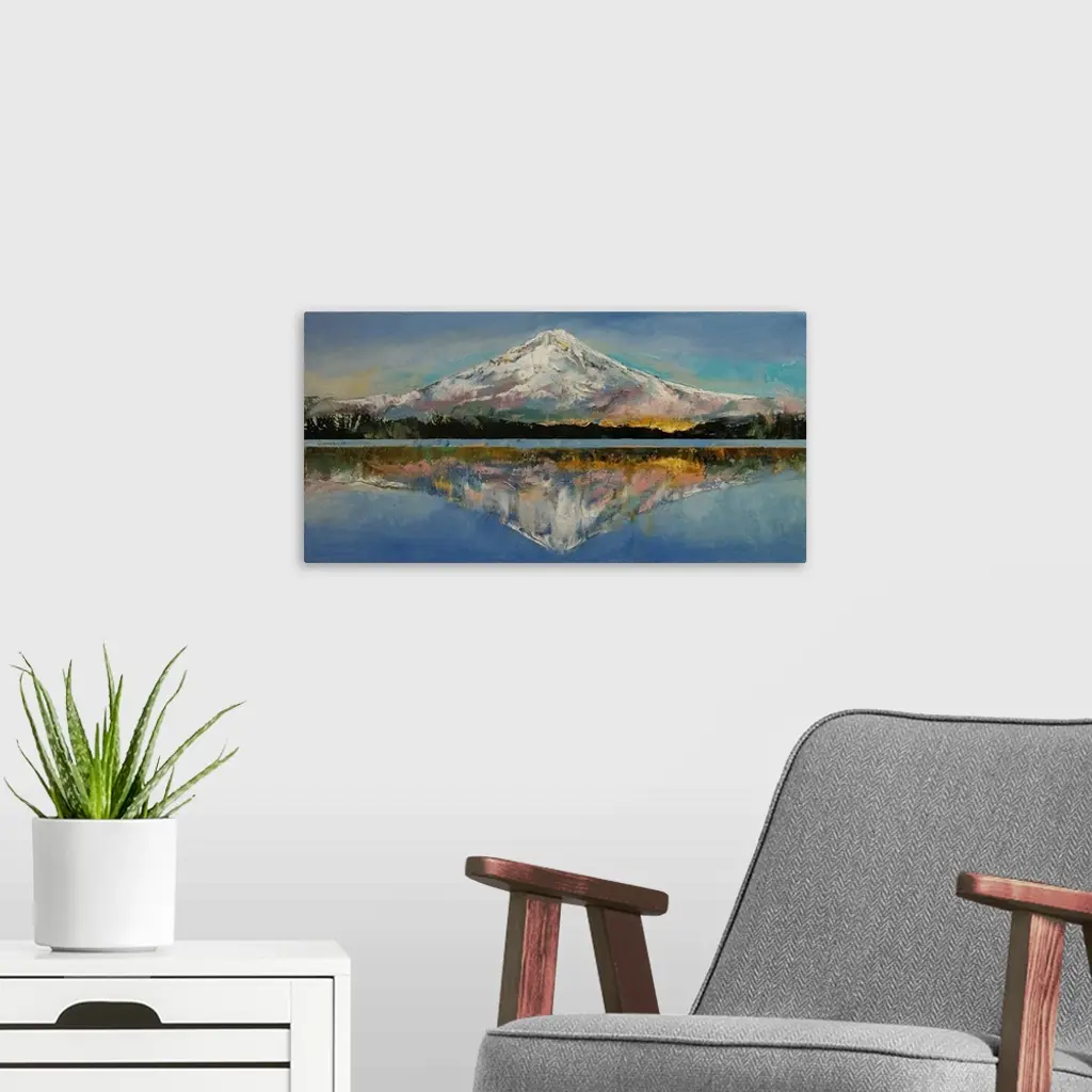 A contemporary painting of Mount Hood reflecting in the lake below it.