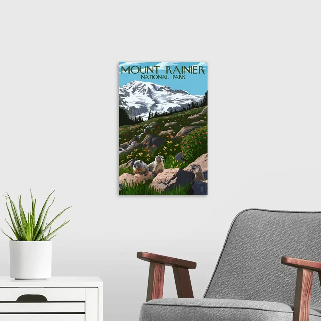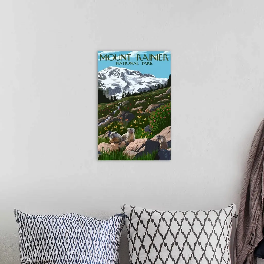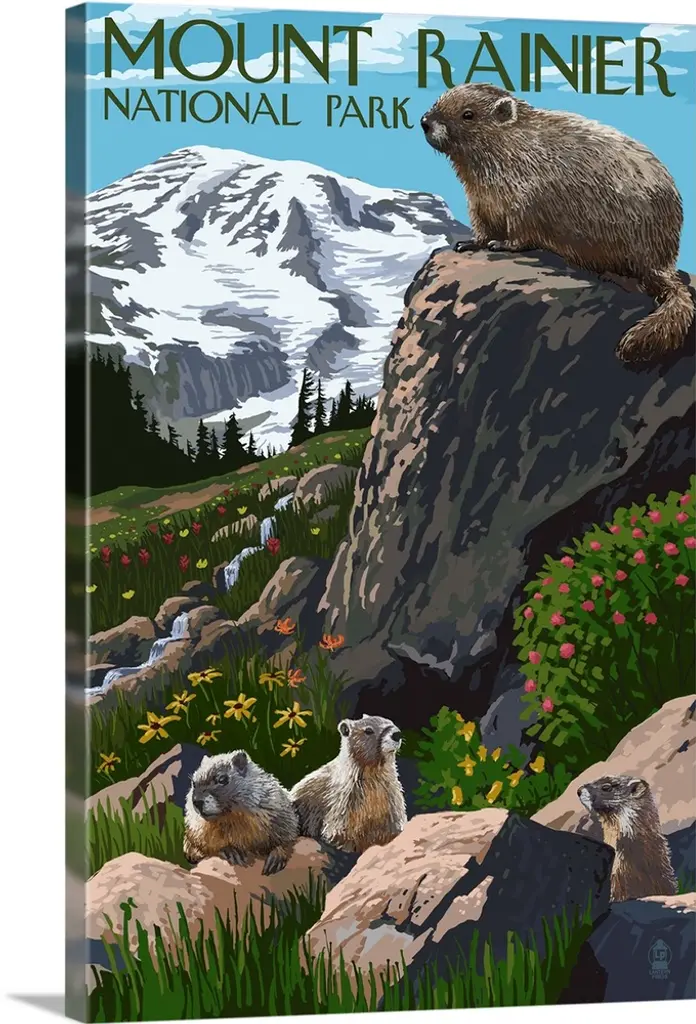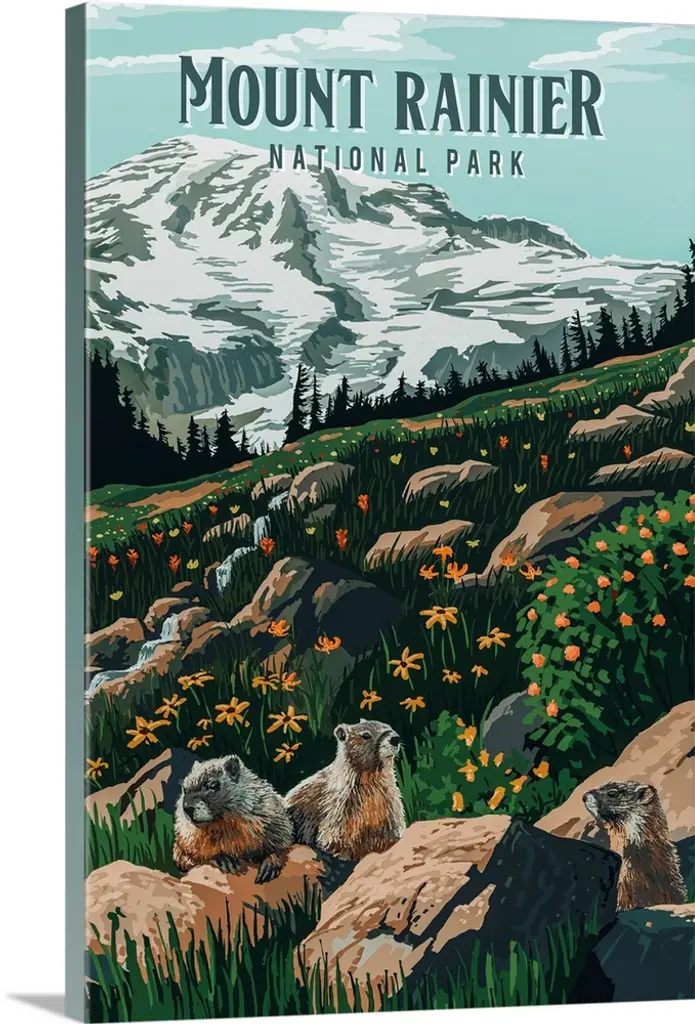 Mount Rainier National Park, Marmot In A Wildflower Field: Retro Travel Poster wall art for home and office decor. Discover canvas art prints, photos, mural, big canvas art and framed wall art in GreatBigCanvas.com's varied collections.
