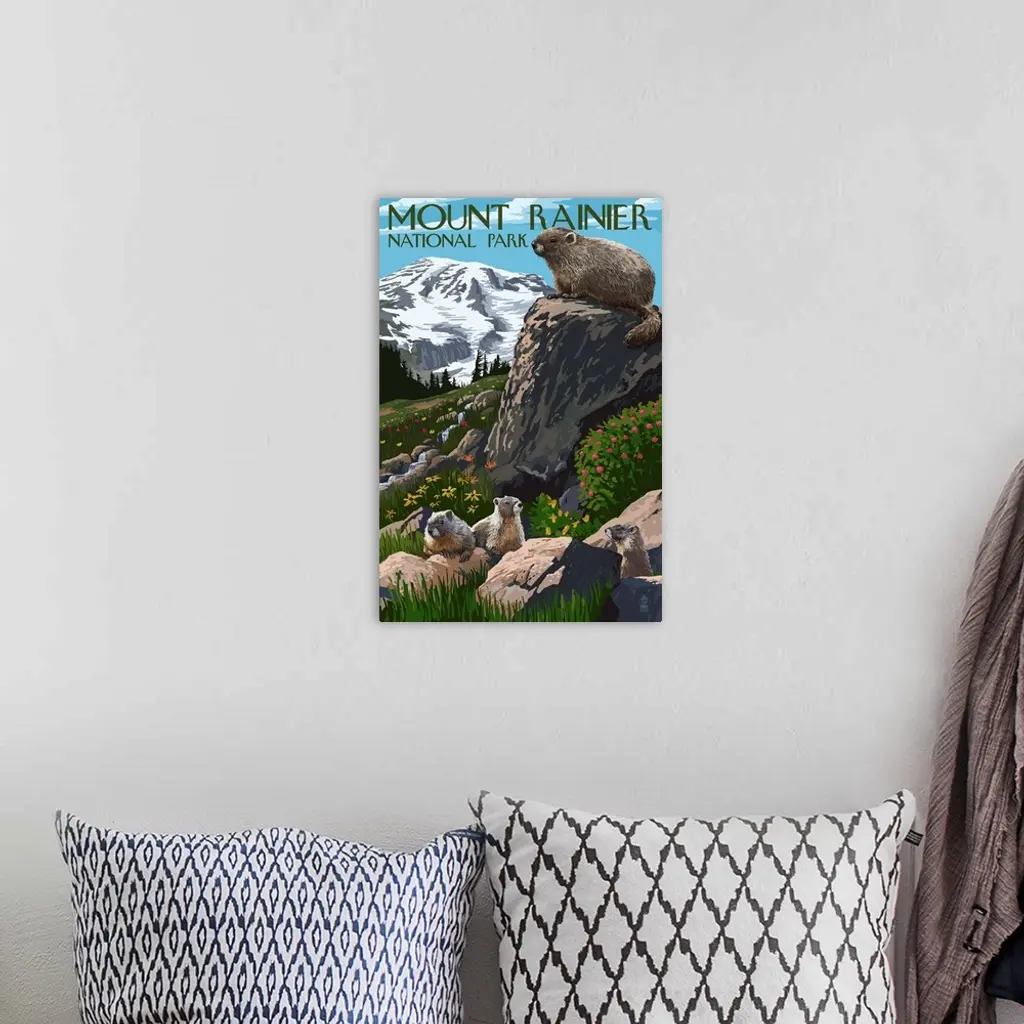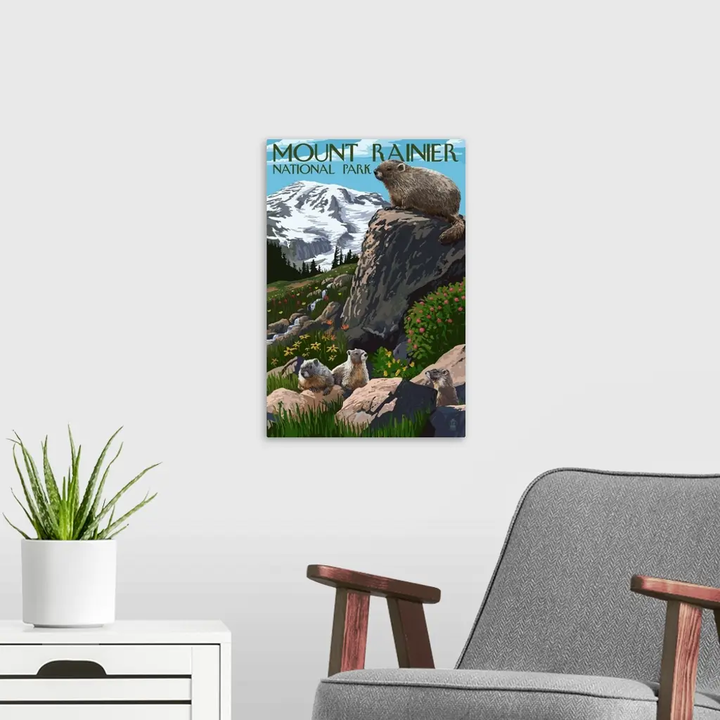Mount Rainier National Park - Marmots: Retro Travel Poster wall art for home and office decor. Discover canvas art prints, photos, mural, big canvas art and framed wall art in GreatBigCanvas.com's varied collections.