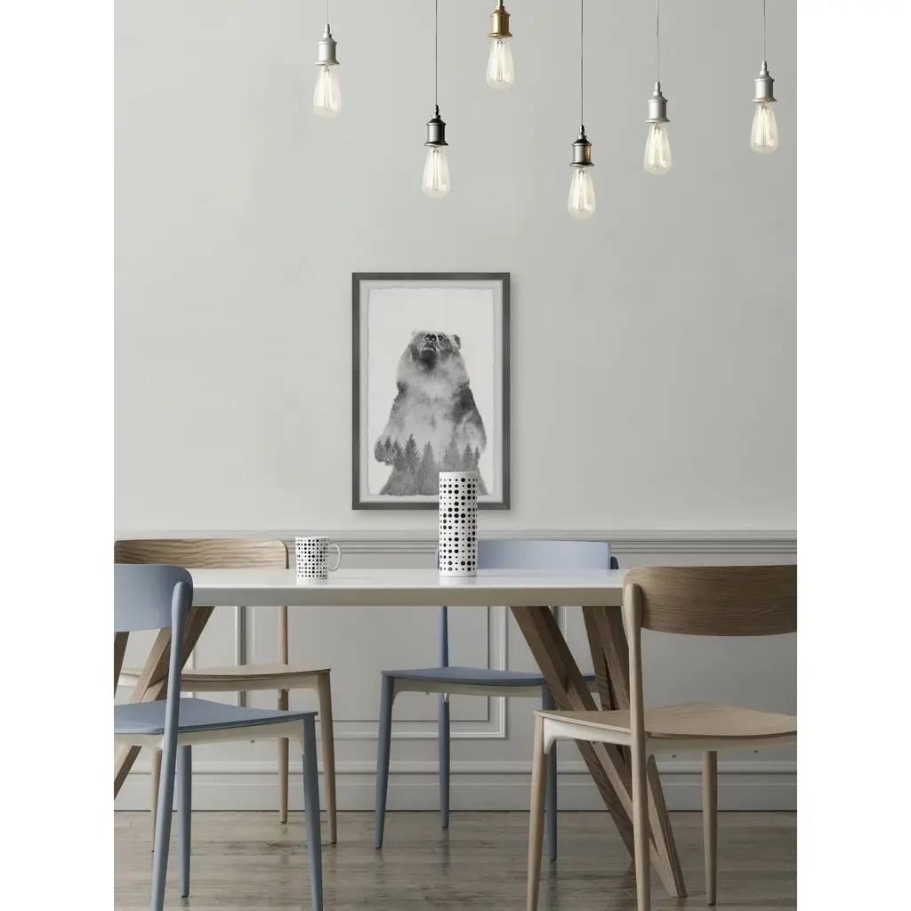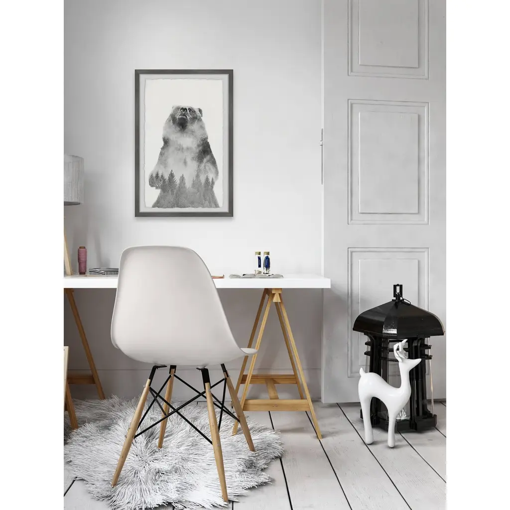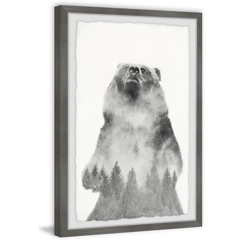 The rearing bear figure is a beauty of the natural world on its own, with a foggy pine forest overlayed on the bear's figure this picture is almost spiritual, capturing the spirit of nature. Proudly printed in the USA, this piece is printed on high quality archive paper and professionally hand-framed. With wall-mounting hooks included, this artful accent is ready to hang up as soon as it reaches your front door. • Top quality Giclee print on high resolution Archive Paper • Hand cut deckled edges • High quality durable non-warping frame • Finished under shatter resistant plexiglass • Arrives ready to hang • Includes a certificate of authenticity • Printed the USA