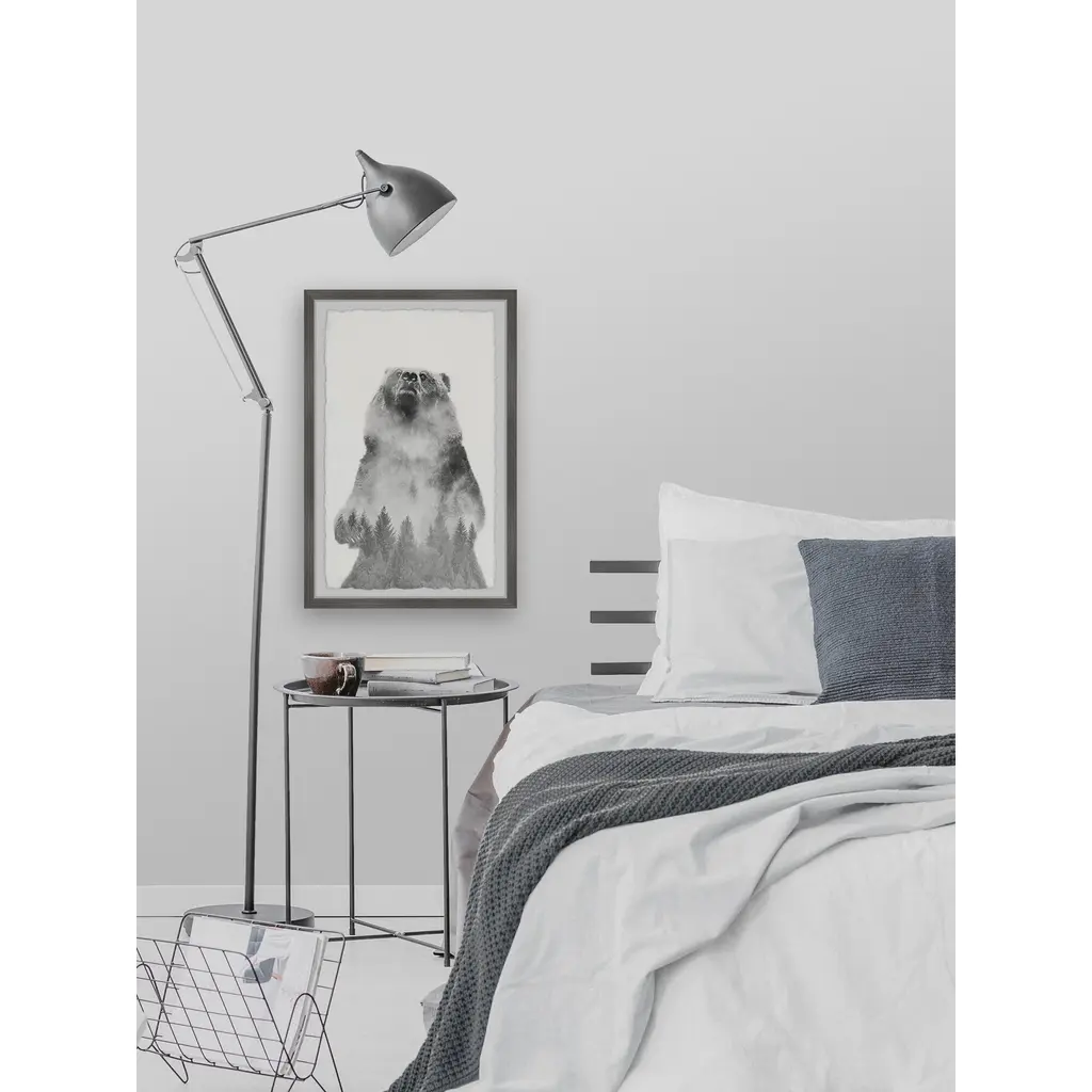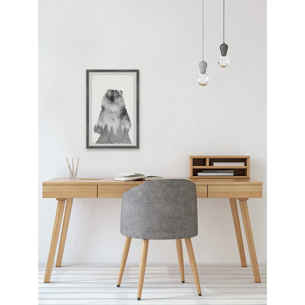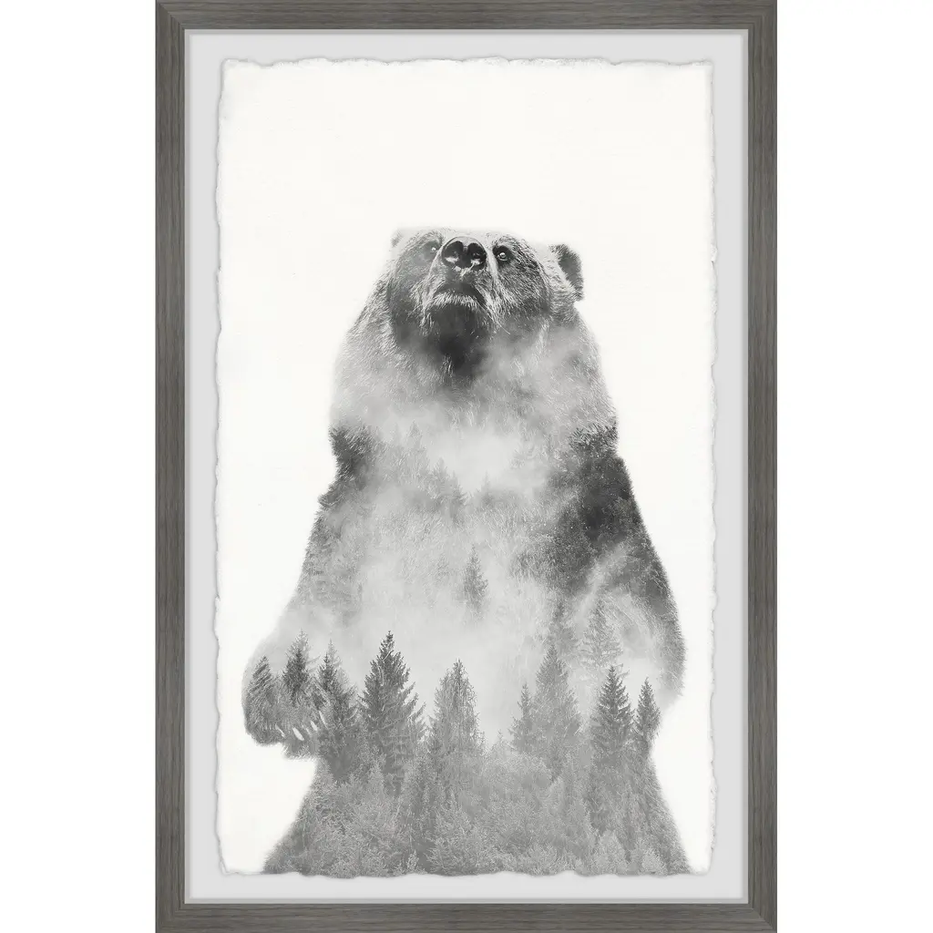 The rearing bear figure is a beauty of the natural world on its own, with a foggy pine forest overlayed on the bear's figure this picture is almost spiritual, capturing the spirit of nature. Proudly printed in the USA, this piece is printed on high quality archive paper and professionally hand-framed. With wall-mounting hooks included, this artful accent is ready to hang up as soon as it reaches your front door. • Top quality Giclee print on high resolution Archive Paper • Hand cut deckled edges • High quality durable non-warping frame • Finished under shatter resistant plexiglass • Arrives ready to hang • Includes a certificate of authenticity • Printed the USA