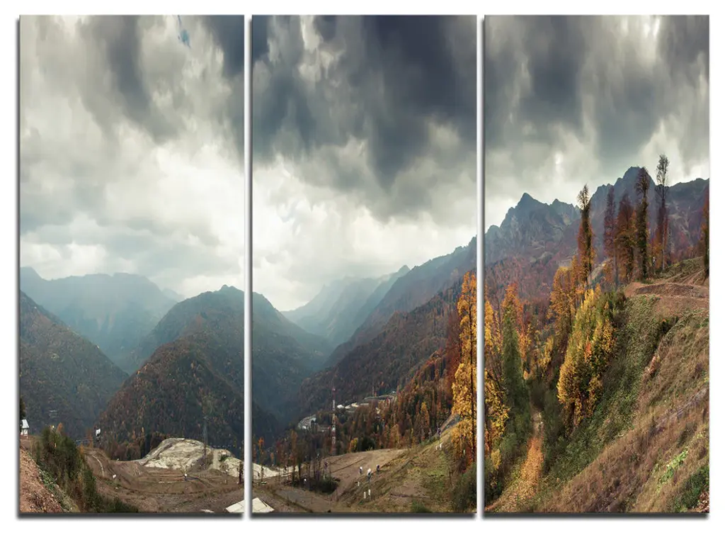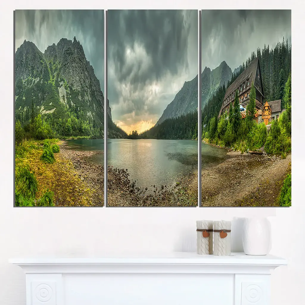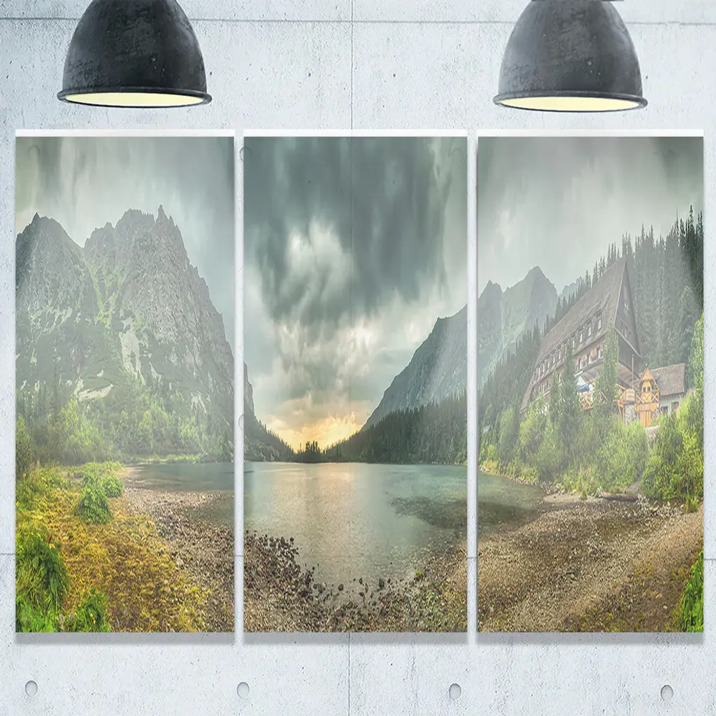 "Mountain Chalet At Sunset Panorama" Metal Wall Art, 3 Panels, 36"x28"