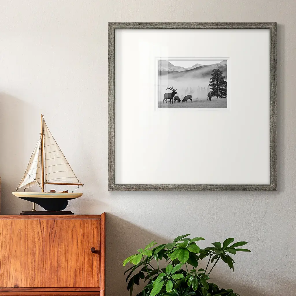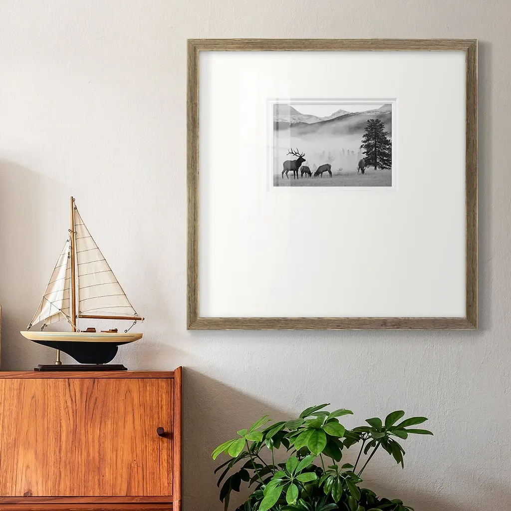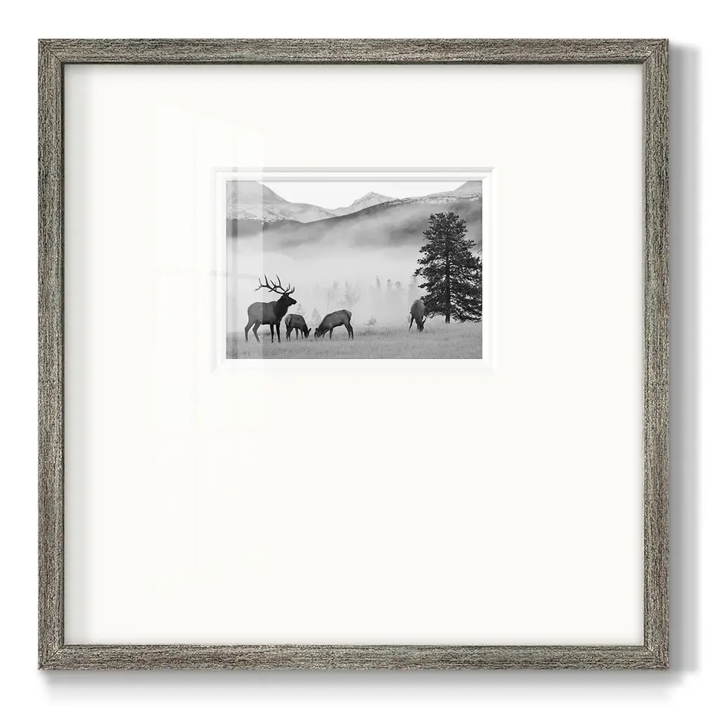 Mountain ElkPremium Framed Print A framed cold pressed paper print featuring superior double matting and quality frame. 2 SIZES AVAILABLE 16''X16''' - Overall Size 20''X20''' - Overall Size Each piece is made to order. Each piece comes with hanging hardware. Made in the USA Ready to Hang Giclee Paper Print Plexiglass Beveled Matt Board Double Matte Board
