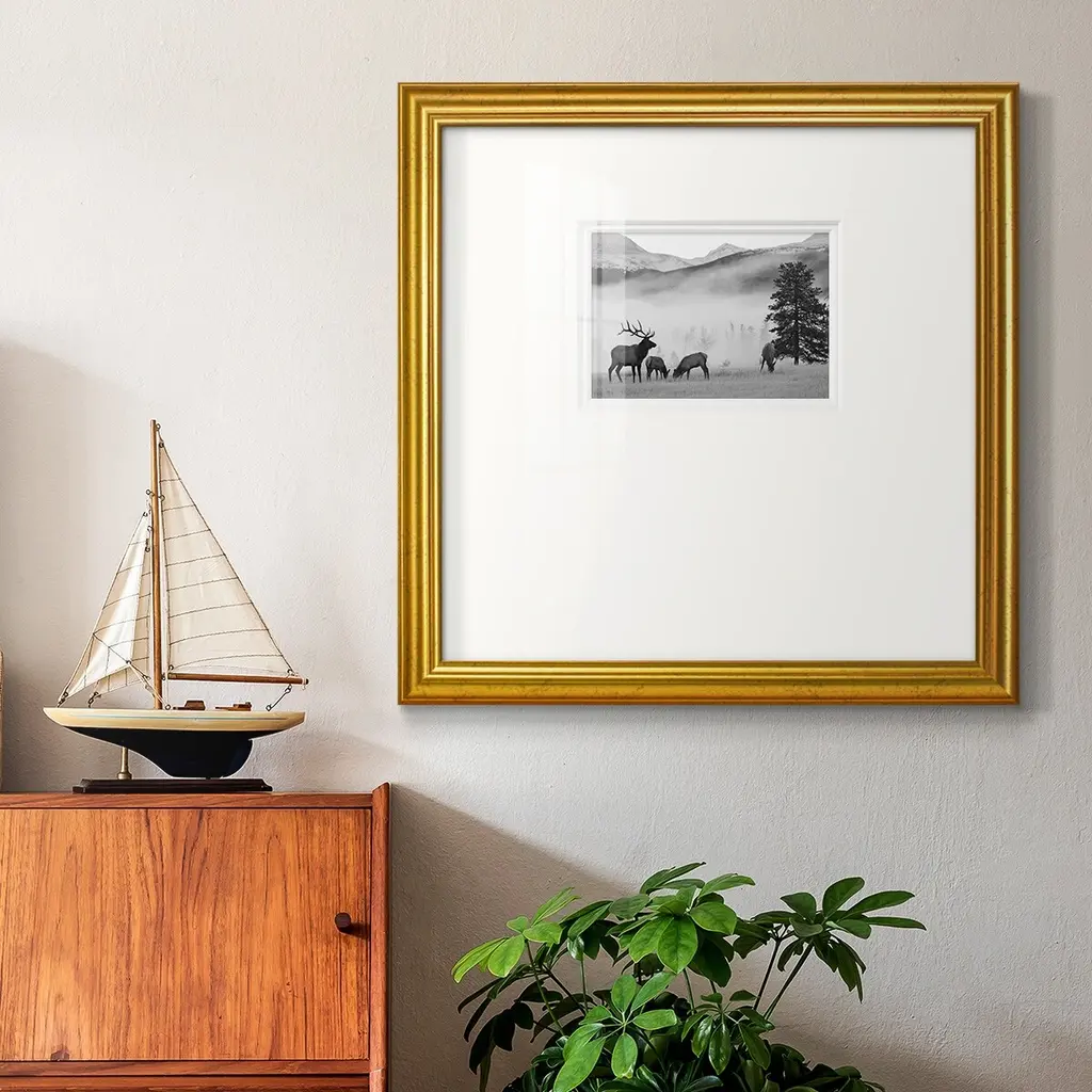 Mountain ElkPremium Framed Print A framed cold pressed paper print featuring superior double matting and quality frame. 2 SIZES AVAILABLE 16''X16''' - Overall Size 20''X20''' - Overall Size Each piece is made to order. Each piece comes with hanging hardware. Made in the USA Ready to Hang Giclee Paper Print Plexiglass Beveled Matt Board Double Matte Board