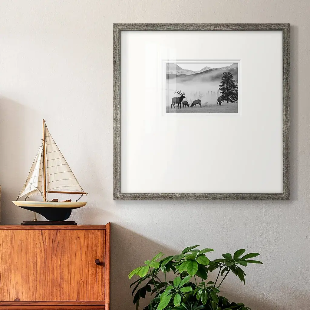 Mountain ElkPremium Framed Print A framed cold pressed paper print featuring superior double matting and quality frame. 2 SIZES AVAILABLE 16''X16''' - Overall Size 20''X20''' - Overall Size Each piece is made to order. Each piece comes with hanging hardware. Made in the USA Ready to Hang Giclee Paper Print Plexiglass Beveled Matt Board Double Matte Board