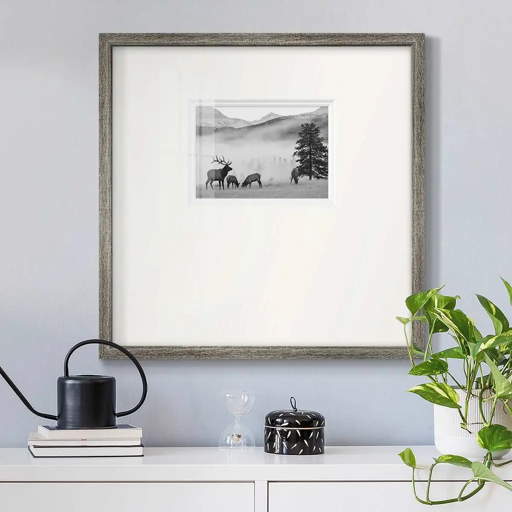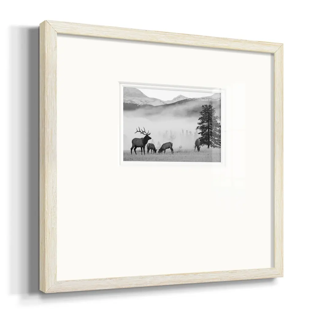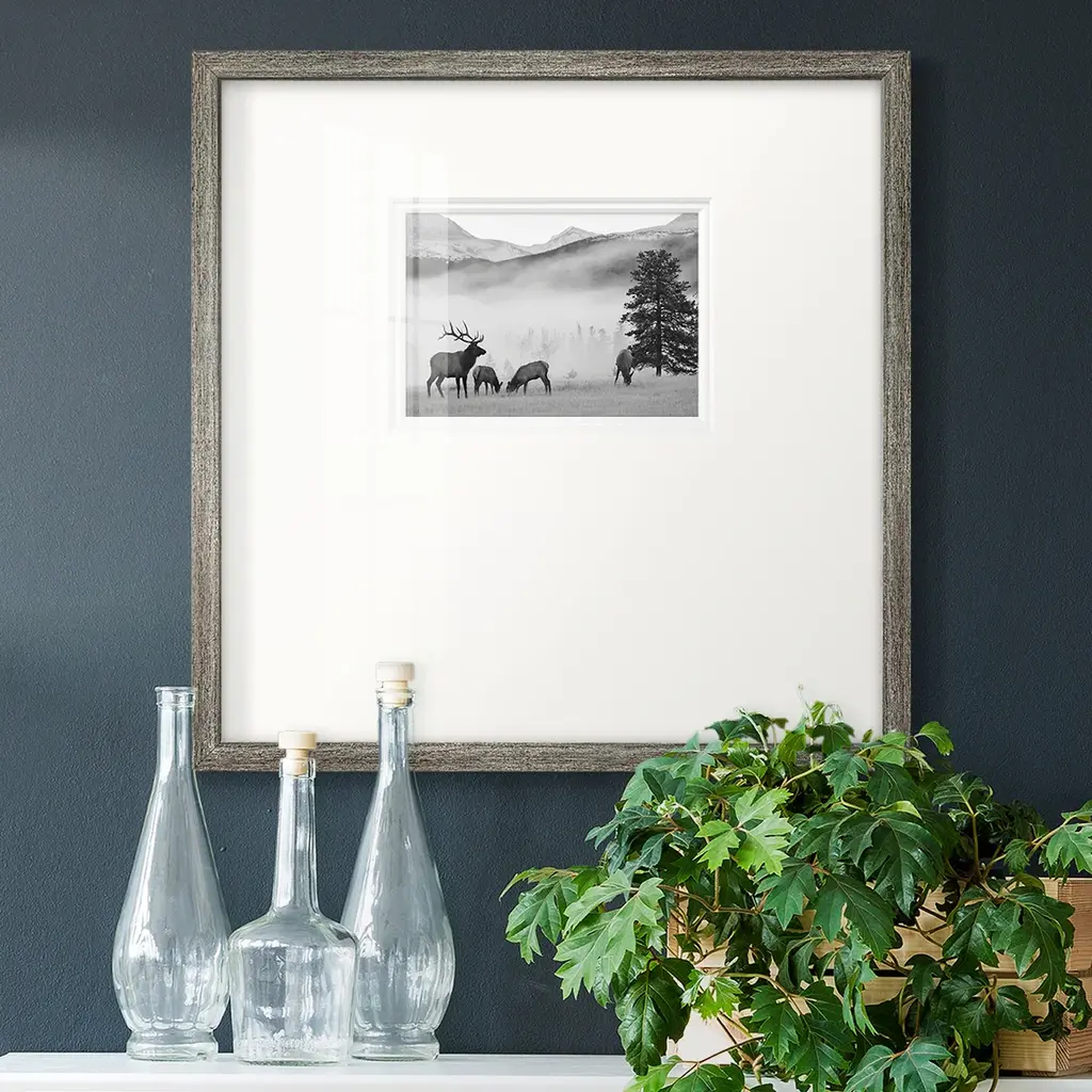 Mountain ElkPremium Framed Print A framed cold pressed paper print featuring superior double matting and quality frame. 2 SIZES AVAILABLE 16''X16''' - Overall Size 20''X20''' - Overall Size Each piece is made to order. Each piece comes with hanging hardware. Made in the USA Ready to Hang Giclee Paper Print Plexiglass Beveled Matt Board Double Matte Board