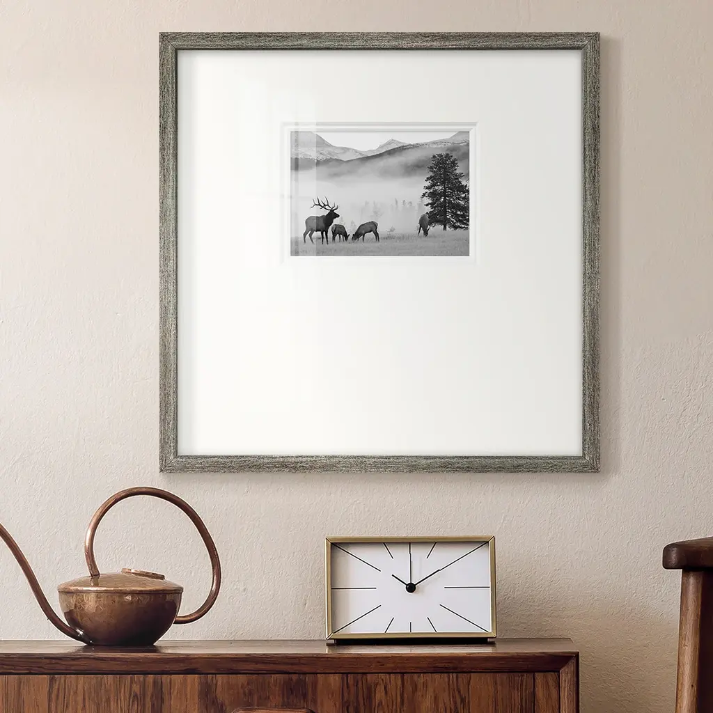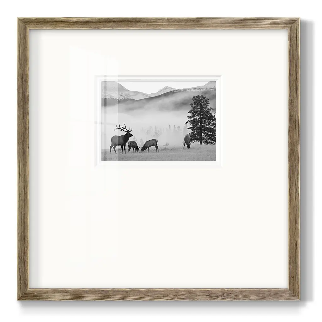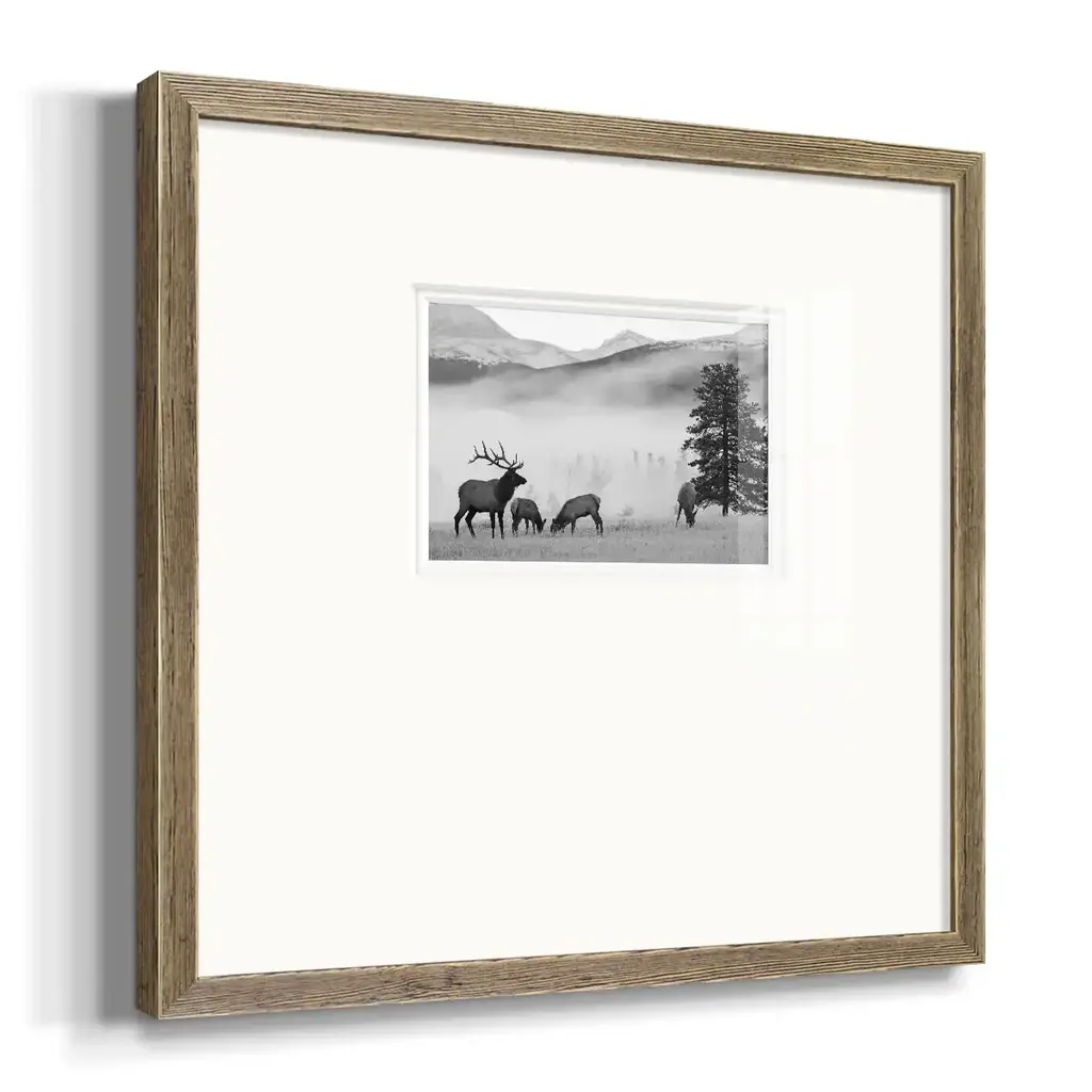 Mountain ElkPremium Framed Print A framed cold pressed paper print featuring superior double matting and quality frame. 2 SIZES AVAILABLE 16''X16''' - Overall Size 20''X20''' - Overall Size Each piece is made to order. Each piece comes with hanging hardware. Made in the USA Ready to Hang Giclee Paper Print Plexiglass Beveled Matt Board Double Matte Board