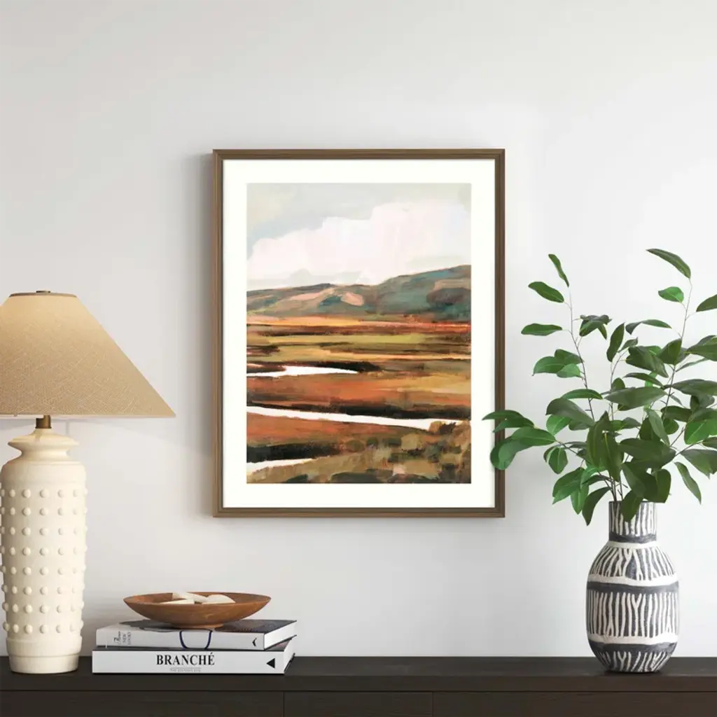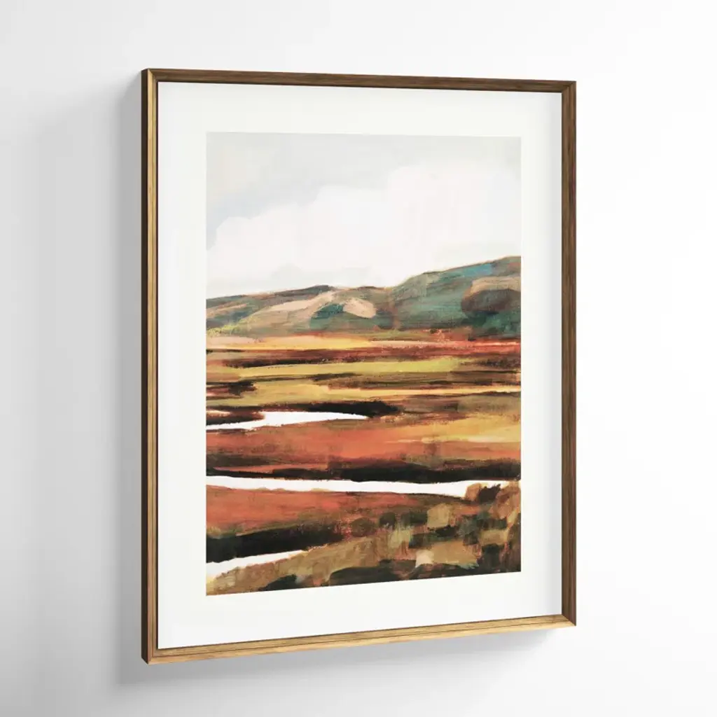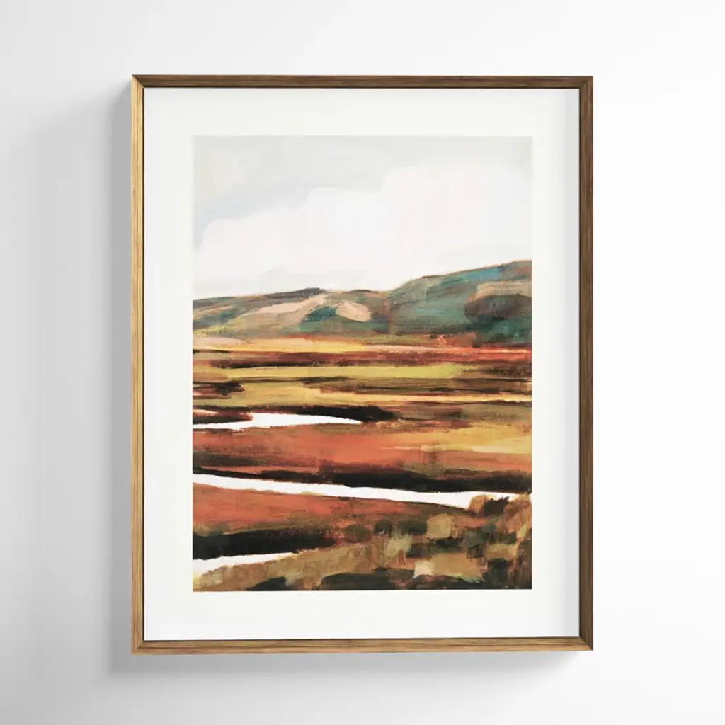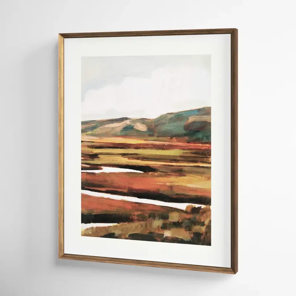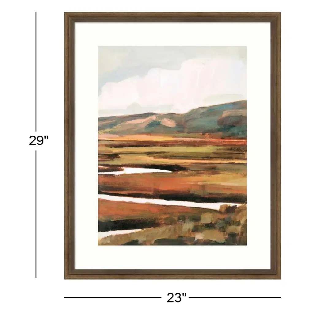 Transport yourself to a tranquil riverside with this exquisite piece by Victoria Borges. Crafted on superior paper and framed in solid wood, it portrays a peaceful river flowing through mountains in autumn hues. The use of fade-resistant inks ensures the rich depth of color and intricate details. Complete with shatterproof, gallery-quality acrylic, this artwork is a visual treat. Plus, it comes ready to hang, bringing instant serenity to your space.