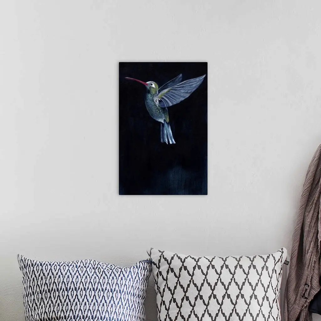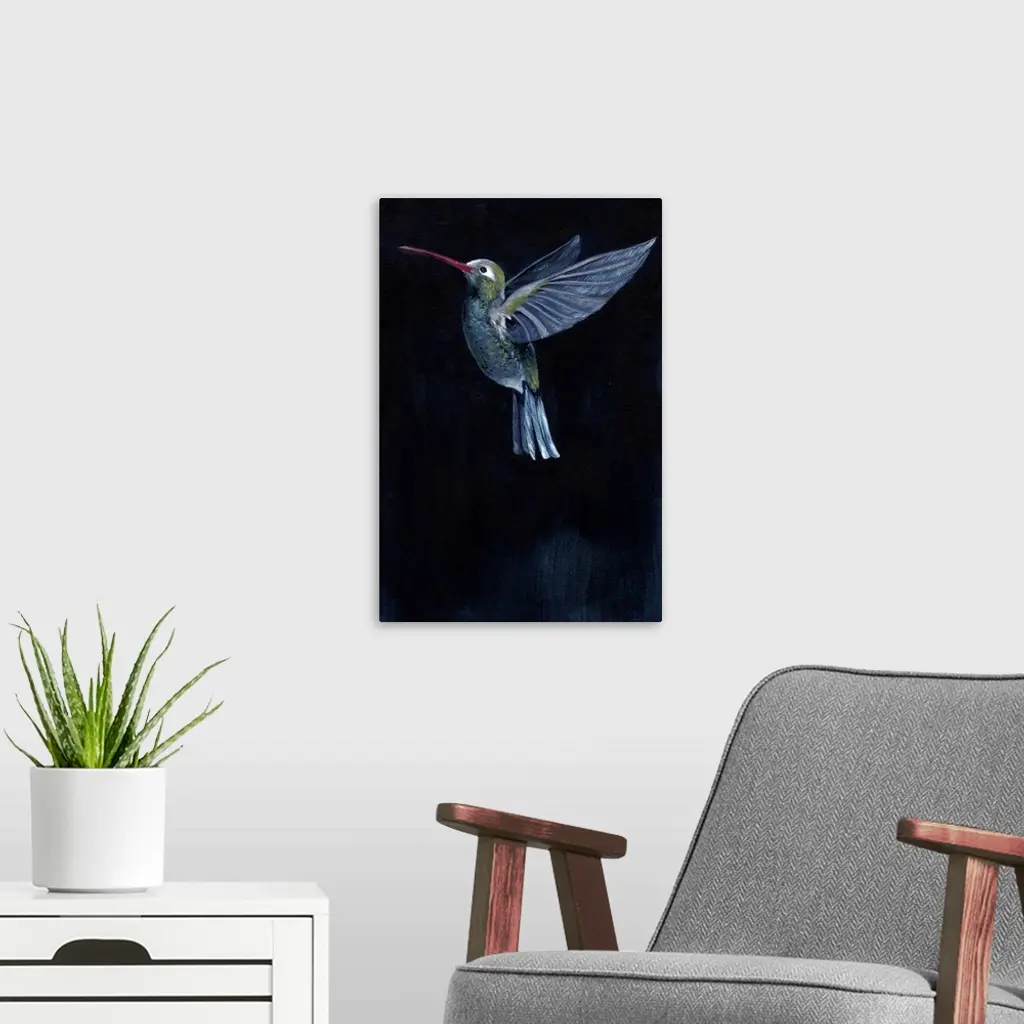 Painting of a hummingbird in flight against a dark background.