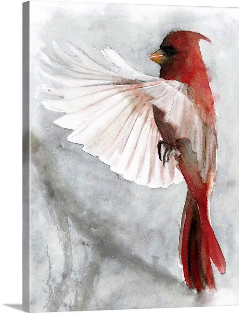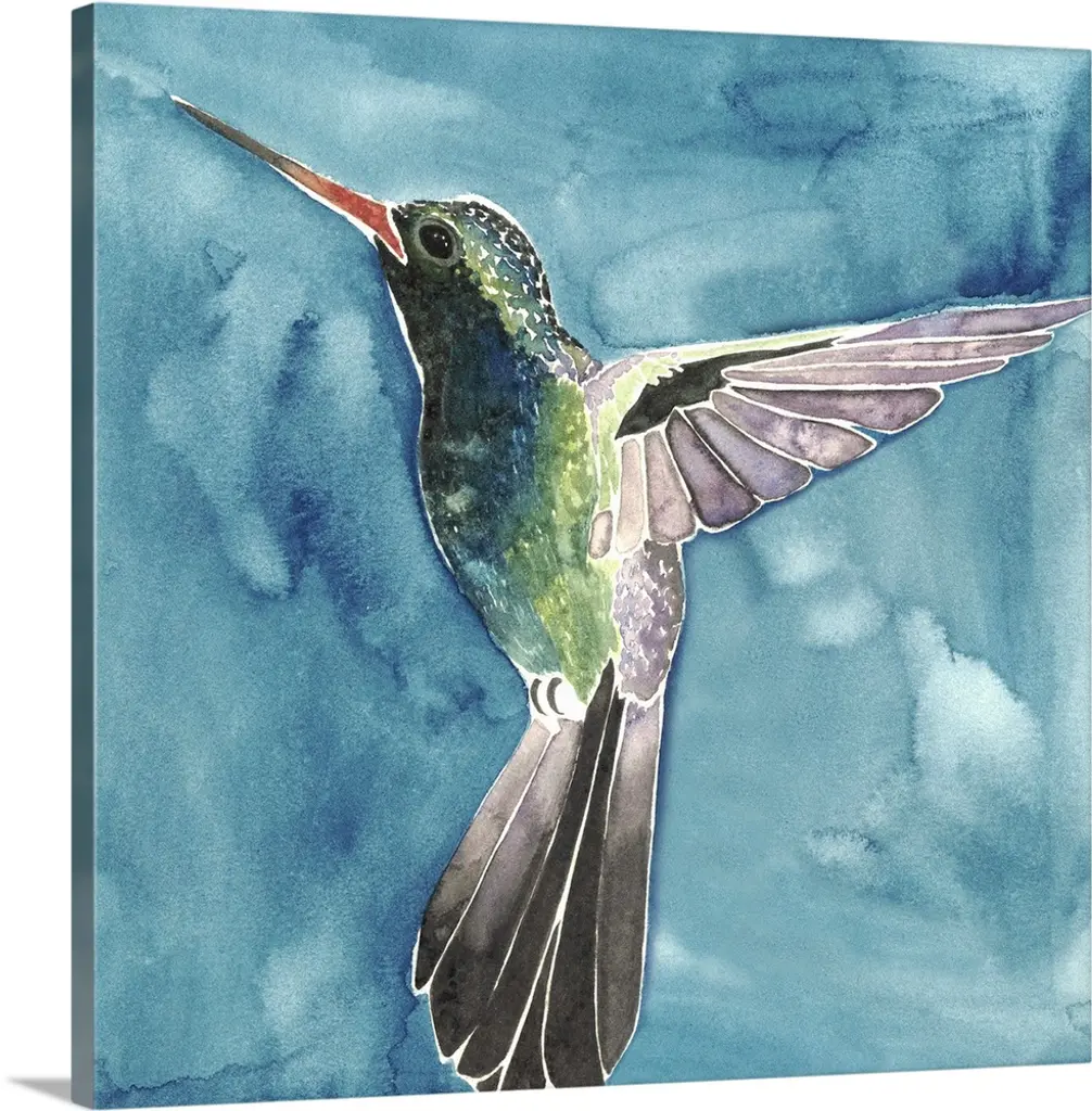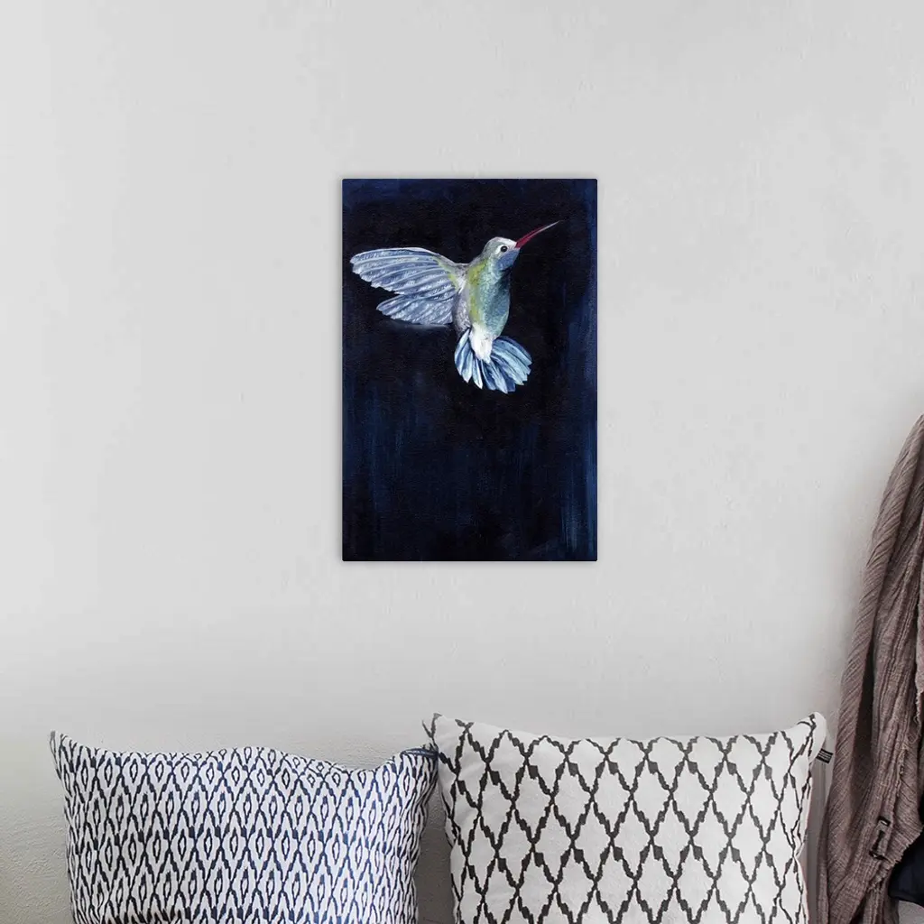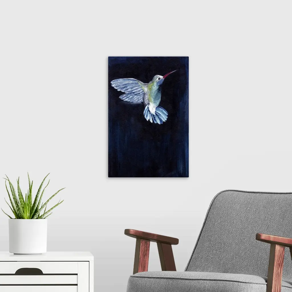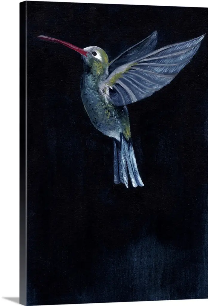 Painting of a hummingbird in flight against a dark background.