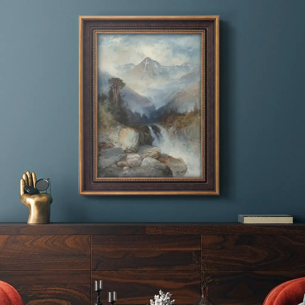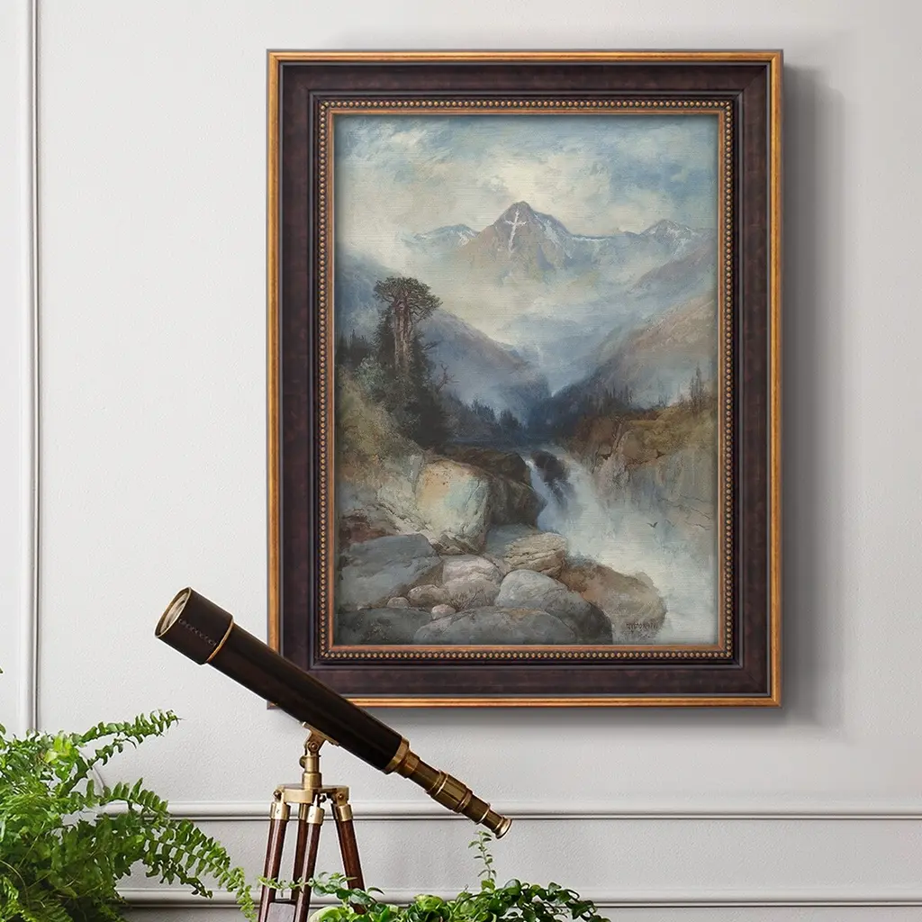 Mountain of the Holy Cross Premium Framed Canvas- Ready to Hang A Premium Framed Canvas created to last. Framed in distressed wood and available in an array of sizes and colors Featuring a beveled a solid wood stretcher bar, each piece comes ready to hand 3 SIZES AVAILABLE 16''X20'' - Overall Size 18'X27'' - Overall Size 24''x36'' - Overall Size Each piece is made to order. Each piece comes with hanging hardware. Made in the USA Ready to Hang Giclee Paper Print Acrylic Glass Beveled Matt Board