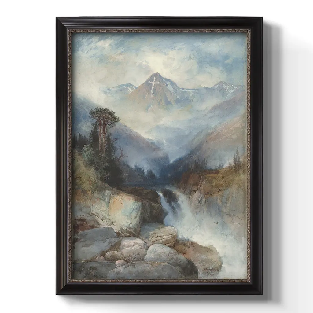 Mountain of the Holy Cross Premium Framed Canvas- Ready to Hang A Premium Framed Canvas created to last. Framed in distressed wood and available in an array of sizes and colors Featuring a beveled a solid wood stretcher bar, each piece comes ready to hand 3 SIZES AVAILABLE 16''X20'' - Overall Size 18'X27'' - Overall Size 24''x36'' - Overall Size Each piece is made to order. Each piece comes with hanging hardware. Made in the USA Ready to Hang Giclee Paper Print Acrylic Glass Beveled Matt Board