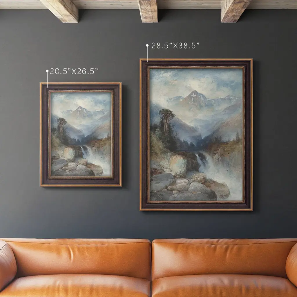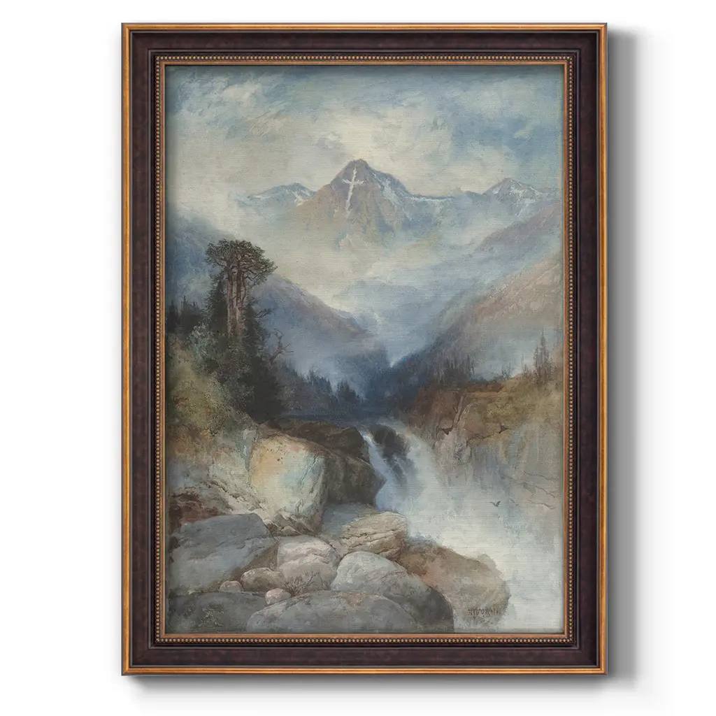 Mountain of the Holy Cross Premium Framed Canvas- Ready to Hang A Premium Framed Canvas created to last. Framed in distressed wood and available in an array of sizes and colors Featuring a beveled a solid wood stretcher bar, each piece comes ready to hand 3 SIZES AVAILABLE 16''X20'' - Overall Size 18'X27'' - Overall Size 24''x36'' - Overall Size Each piece is made to order. Each piece comes with hanging hardware. Made in the USA Ready to Hang Giclee Paper Print Acrylic Glass Beveled Matt Board