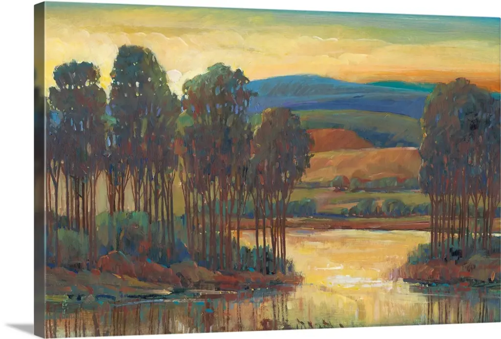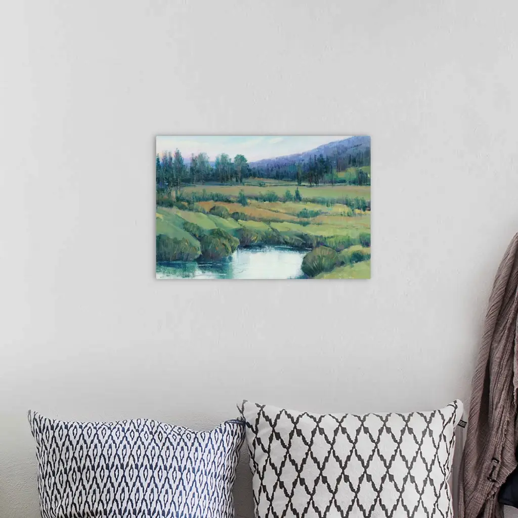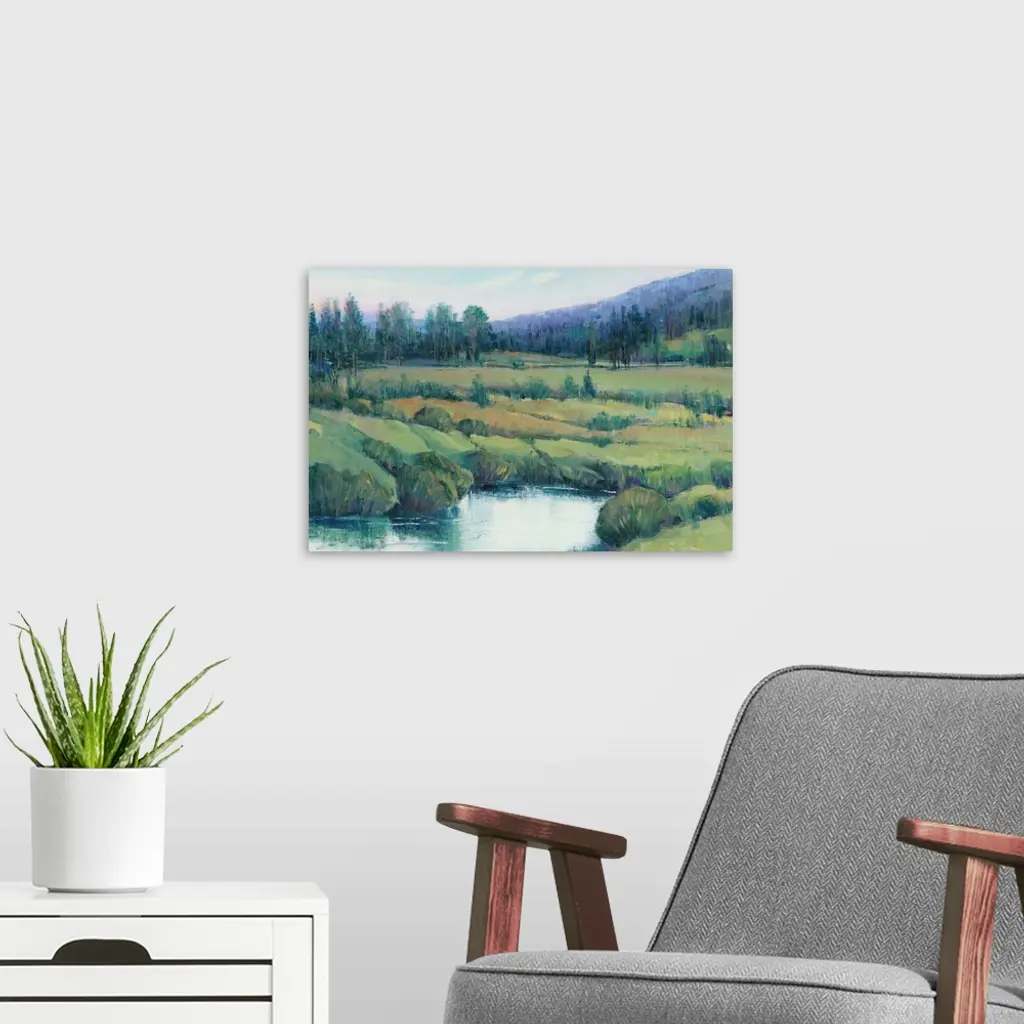 Landscape painting of a tree lined meadow with a mountain range in the distance.