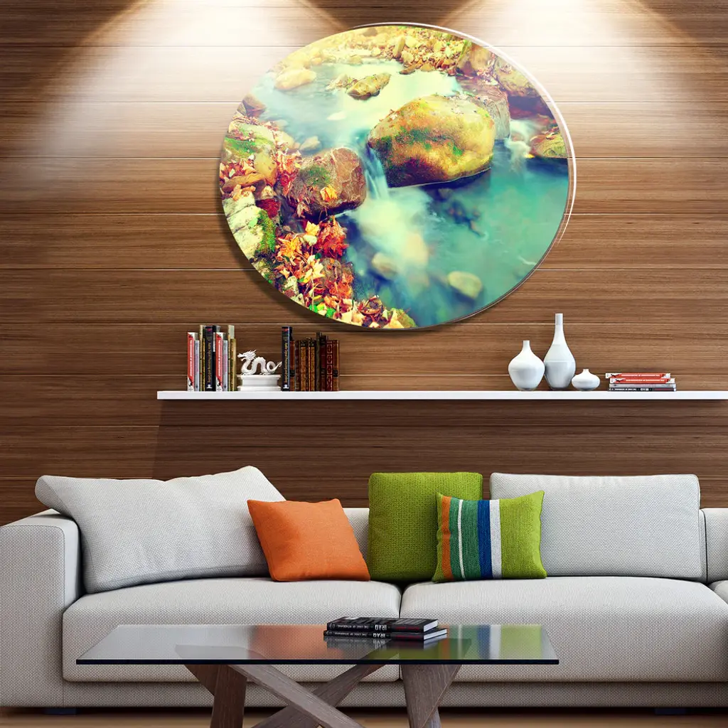 Bring Contemporary Abstraction to your home with this large Circle Metal wall art. This Mountain River with Stones Metal Artwork makes it the focal point of any room or office. - White Gloss Coating ensures colors are extra vibrant with light reflection.- Aluminum grade Sheet Metal with 1 inch mounting frame on the back giving the illusion that the artwork is floating on the wall..- Mounting Brackets are included along with instructions.- High Quality Digital images are created directly into a glossy aluminum panel producing a stunning and captivating print into the glossy finish of the metal.- Water, Fire and Scratch resistant HD Aluminum panels.- Looks better than any photo paper and guaranteed to last at least 20 years- Easy to clean with a microfiber cloth. Colors are far superior to regular Canvas Art. - Easy to Hang