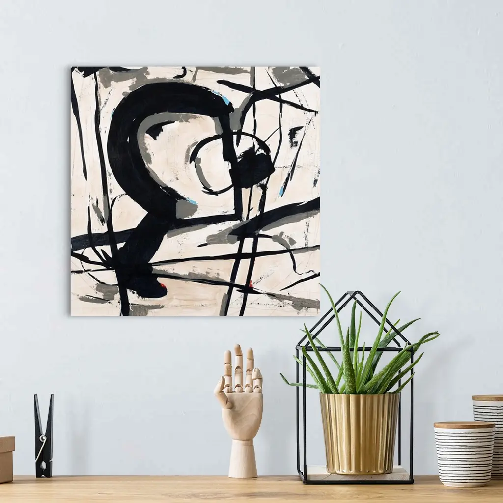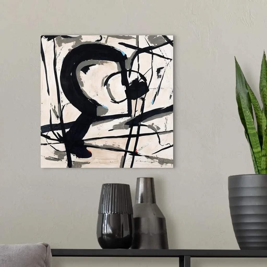 Contemporary abstract painting using bold black lines against a neutral toned background.