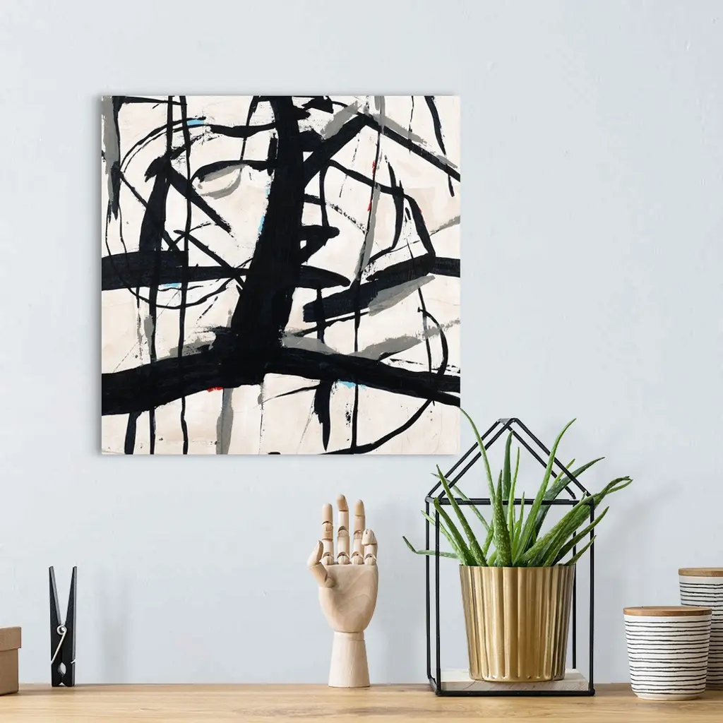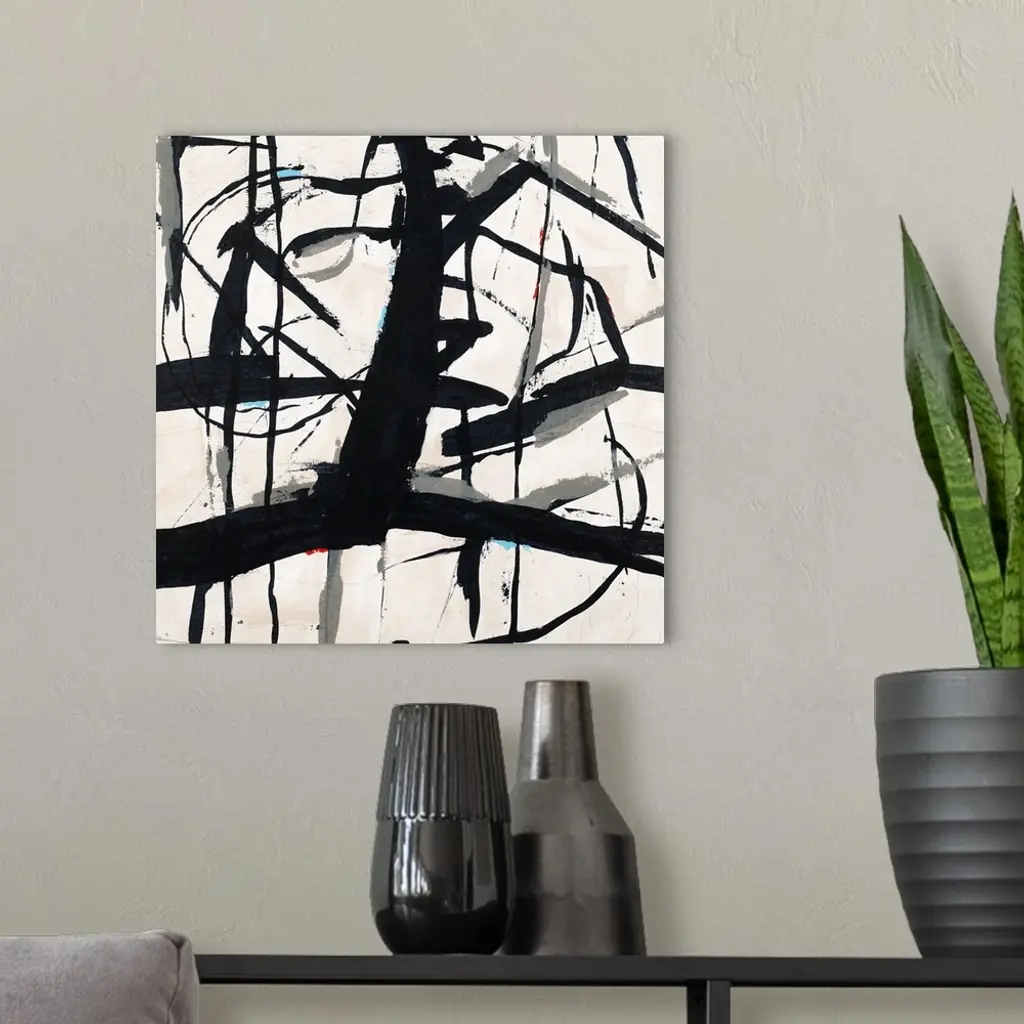 Contemporary abstract painting using bold black lines against a neutral toned background.