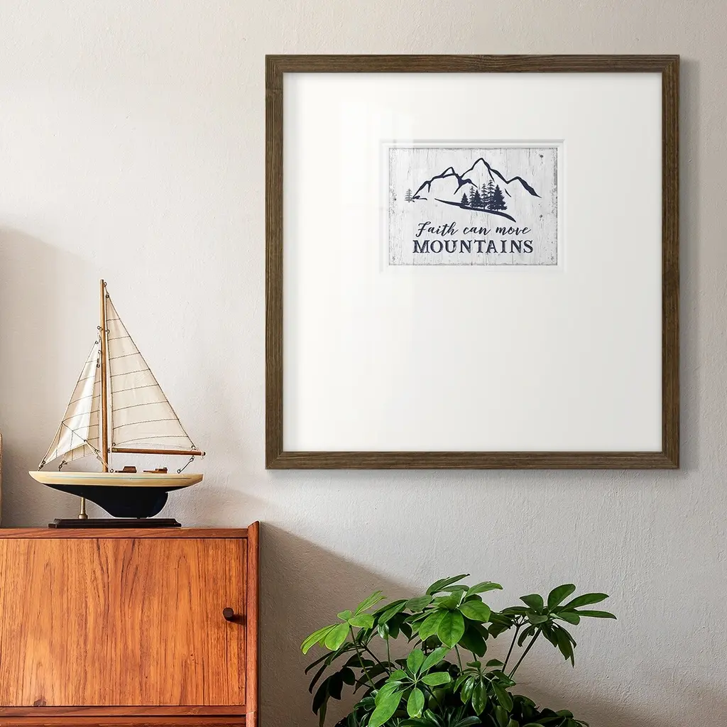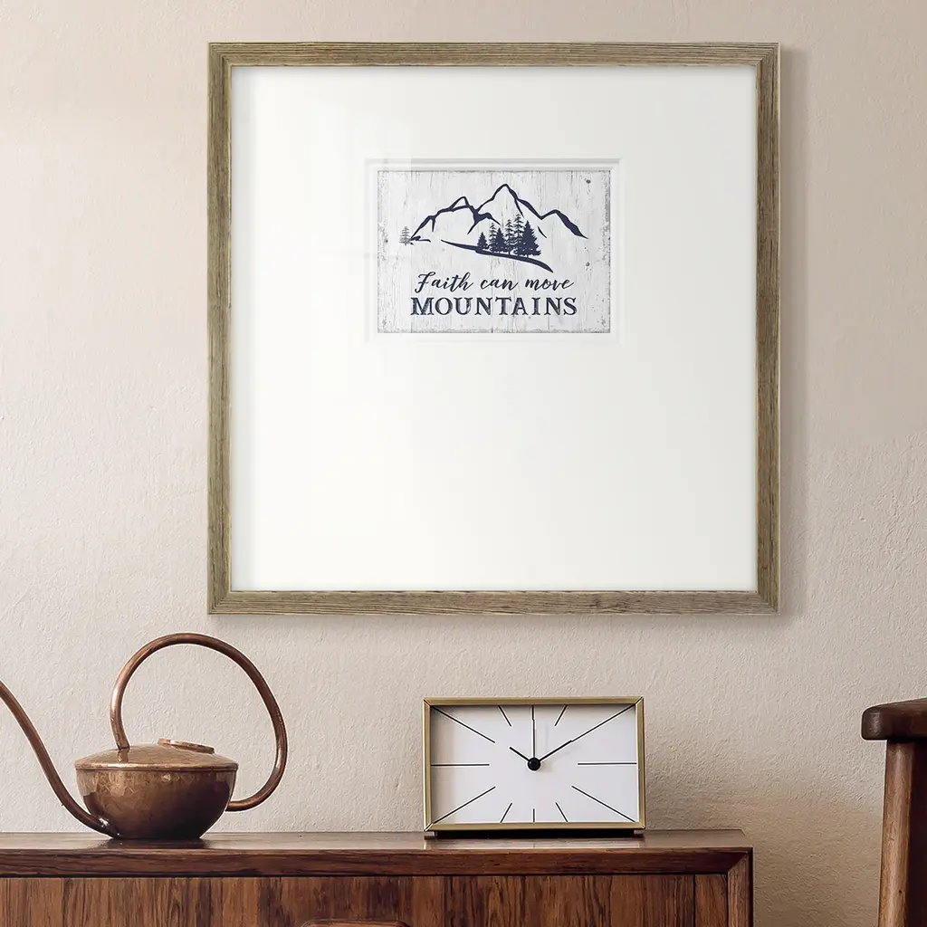 Move MountainsPremium Framed Print A framed cold pressed paper print featuring superior double matting and quality frame. 2 SIZES AVAILABLE 16''X16''' - Overall Size 20''X20''' - Overall Size Each piece is made to order. Each piece comes with hanging hardware. Made in the USA Ready to Hang Giclee Paper Print Plexiglass Beveled Matt Board Double Matte Board