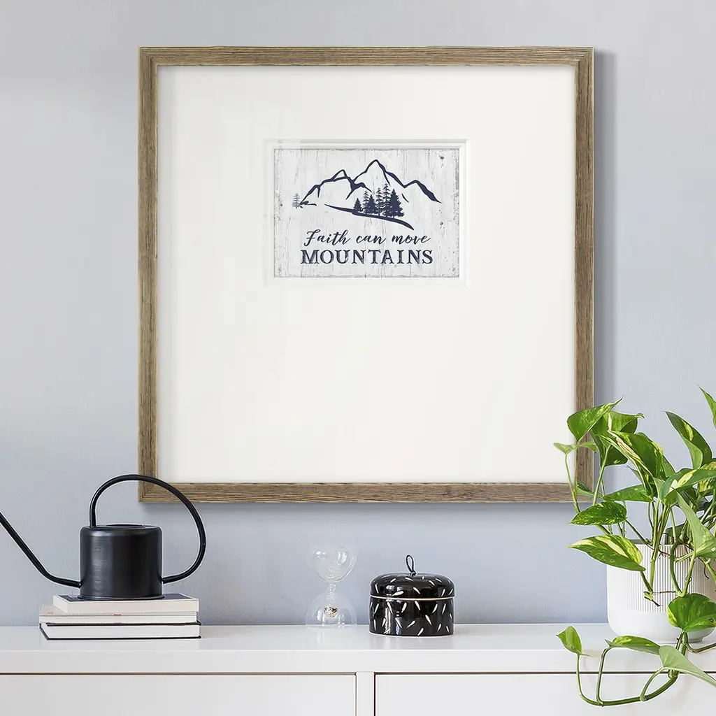 Move MountainsPremium Framed Print A framed cold pressed paper print featuring superior double matting and quality frame. 2 SIZES AVAILABLE 16''X16''' - Overall Size 20''X20''' - Overall Size Each piece is made to order. Each piece comes with hanging hardware. Made in the USA Ready to Hang Giclee Paper Print Plexiglass Beveled Matt Board Double Matte Board