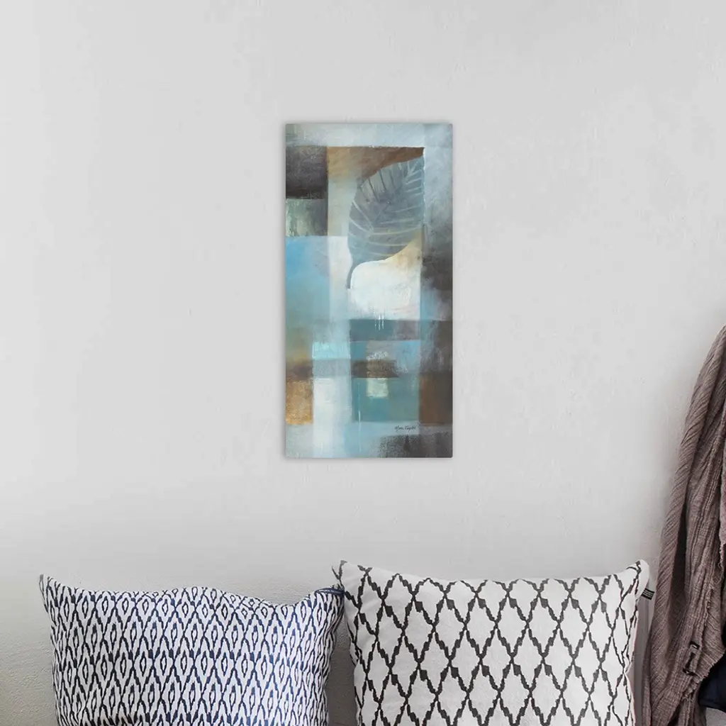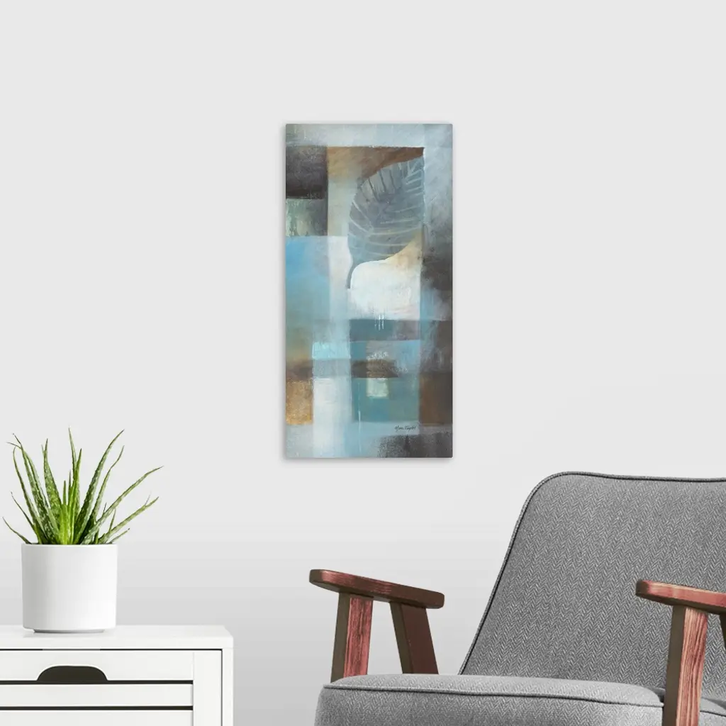 Contemporary abstract painting of geometric shapes and leaves in cool tones.