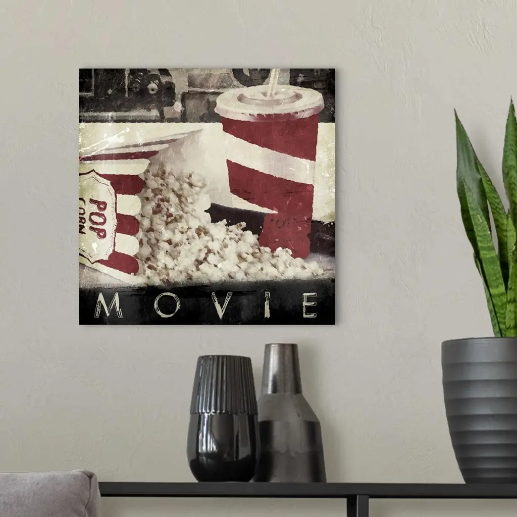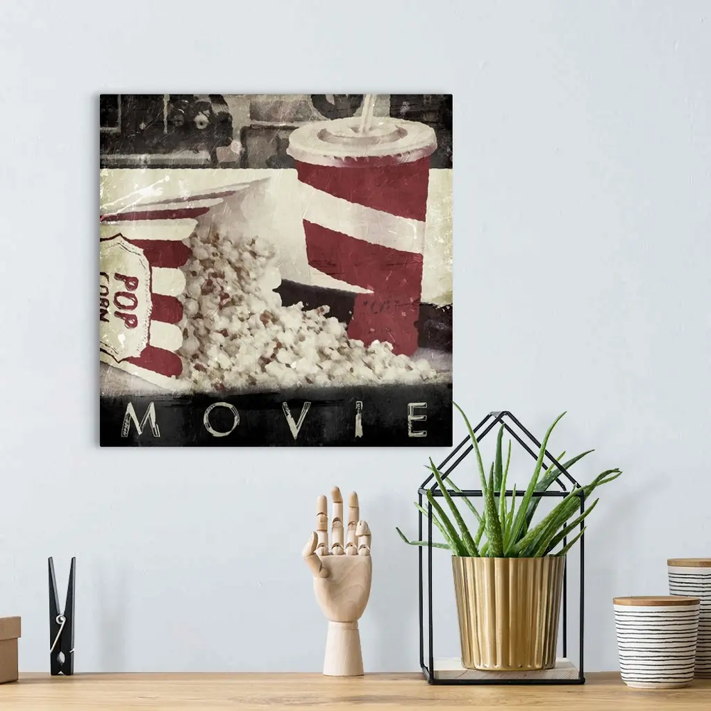 A vintage square theater art piece with the word ?Movie? at painted the bottom.�