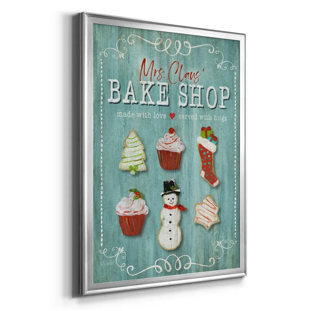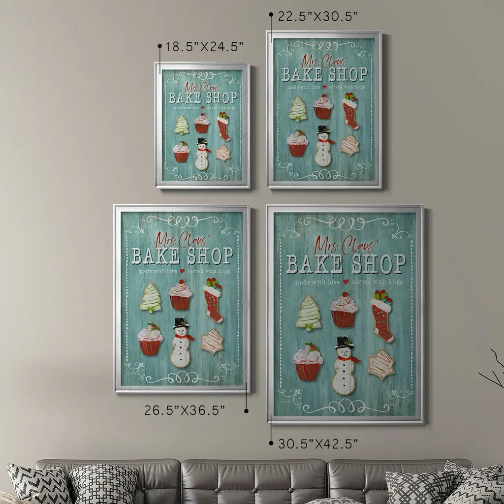 Mrs. Claus Bake Shop Premium Framed Print - Ready to Hang A Premium Framed Print created to last. Framed in distressed wood and available in an array of sizes and colors Featuring a beveled a solid wood stretcher bar, each piece comes ready to hand 4 SIZES AVAILABLE 30.5''X42.5'' - Overall Size 26.5'X36.5'' - Overall Size 22.5''x30.5'' - Overall Size 18.5''x24.5'' - Overall Size Each piece is made to order. Each piece comes with hanging hardware. Made in the USA Ready to Hang