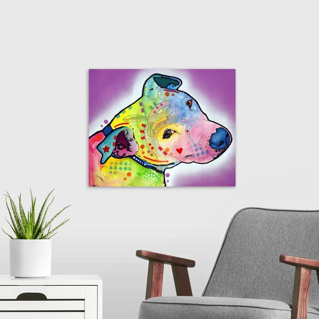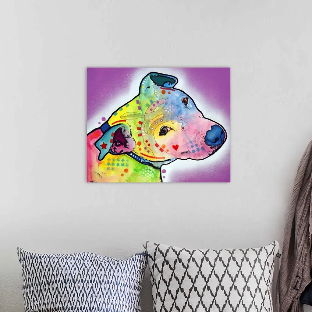 Contemporary stencil painting of a dog filled with various colors and patterns.