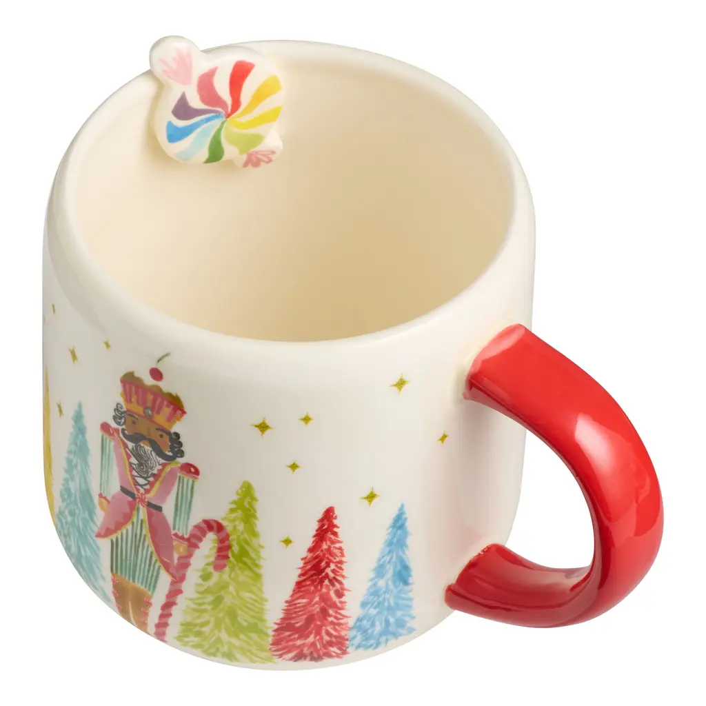 Bring a dash of fun to your festive coffee or cocoa with this exclusive mug, detailed with hand-painted accents and showcasing our playful Jingle Mingle nutcracker artwork. It's full of Christmas character with a red handle, dimensional candy at the rim, and colorful holiday trees. Perfect for displaying on a coffee bar, this stoneware cup brings a merry feeling to all your favorite cozy beverages.