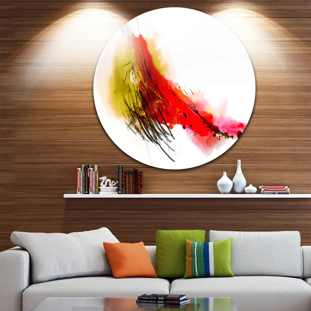 Bring Contemporary Abstraction to your home with this large Circle Metal wall art. This Multicolor Stain Metal Artwork makes it the focal point of any room or office. - White Gloss Coating ensures colors are extra vibrant with light reflection.- Aluminum grade Sheet Metal with 1 inch mounting frame on the back giving the illusion that the artwork is floating on the wall..- Mounting Brackets are included along with instructions.- High Quality Digital images are created directly into a glossy aluminum panel producing a stunning and captivating print into the glossy finish of the metal.- Water, Fire and Scratch resistant HD Aluminum panels.- Looks better than any photo paper and guaranteed to last at least 20 years- Easy to clean with a microfiber cloth. Colors are far superior to regular Canvas Art. - Easy to Hang