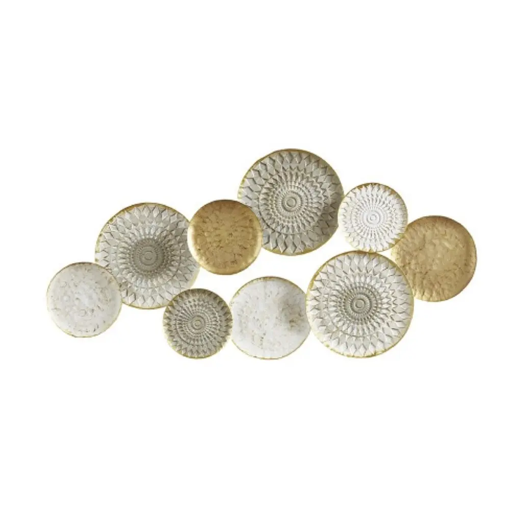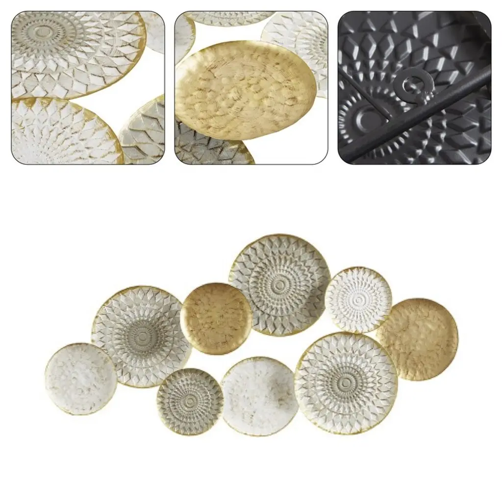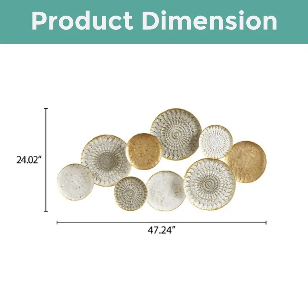 Product Type: General ItemMain Color: MulticolorMain Material: CottonAdd a one-of-a-kind transitional look to your home with the Madison Park Legion Multi-colored Geometric Metal Discs Wall Decor. This metal wall decor features multi-colored matte plates welded together in a unique pattern to create a stunning transitional look. Flaunting a simple and eye-catching design, this metal wall decor is perfect for displaying in your living room, kitchen, or home office.Overall:47.24"W x 24.02"H x 1.97"D47.24"W x 24.02"H x 1.97"DMulti-colored dimensional wall décor with aged matte finish in gold, white, silverGeometric designs on metal platesKeyhole hanger to hang vertically or horizontallyIndoor use only. Spot clean only
