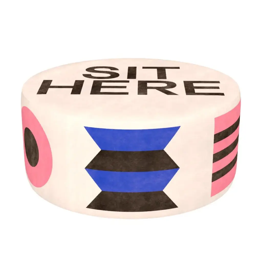 Introducing the Multicolored Print Pouf by Qeeboo Oggian. Designed by Marco Oggian, these playful poufs feature stylish patterns and a "SIT HERE" sign, inviting relaxation and comfort. Elevate your space with this exclusive and luxurious addition.