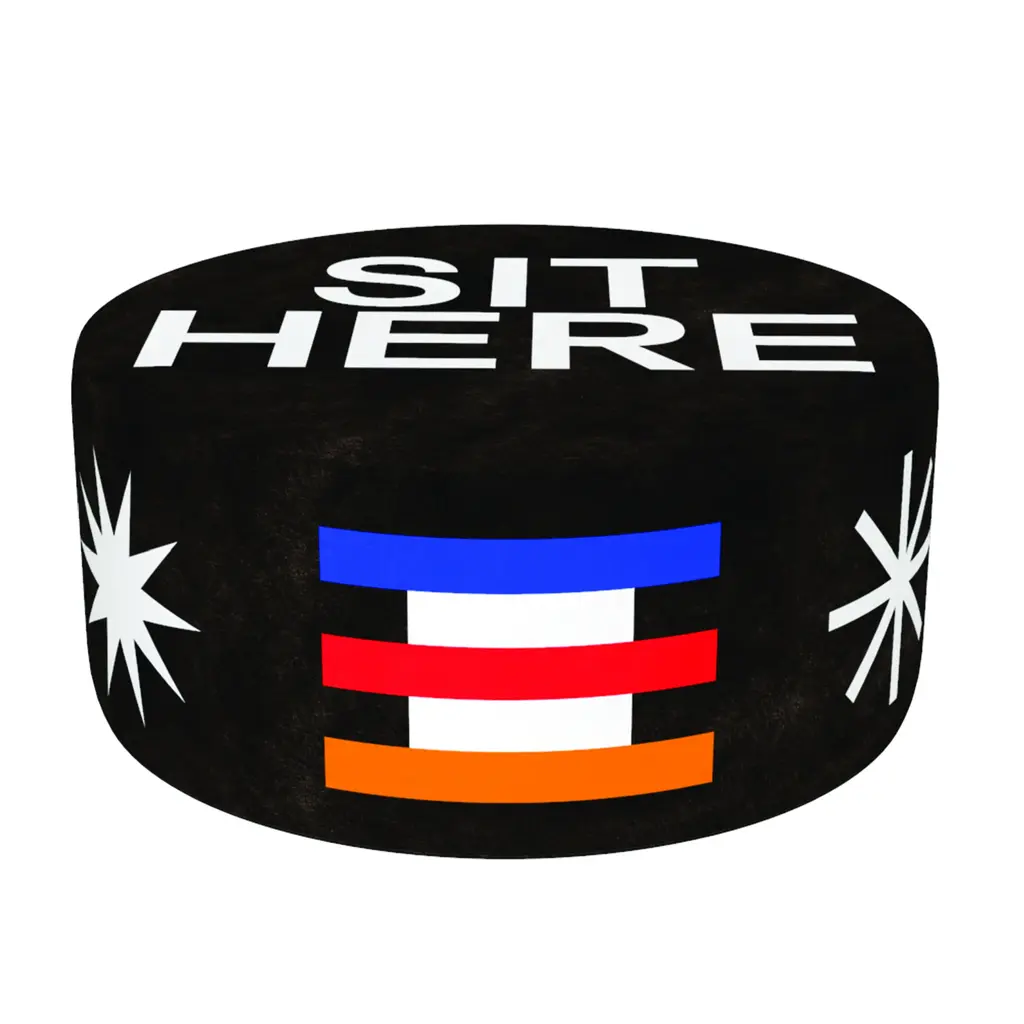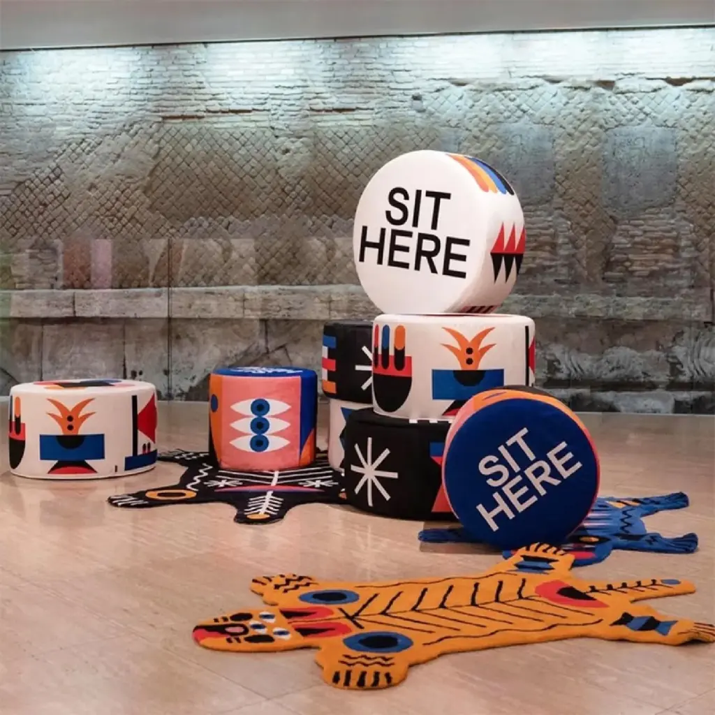 Introducing the Multicolored Print Pouf by Qeeboo Oggian. Designed by Marco Oggian, these playful poufs feature stylish patterns and a "SIT HERE" sign, inviting relaxation and comfort. Elevate your space with this exclusive and luxurious addition.
