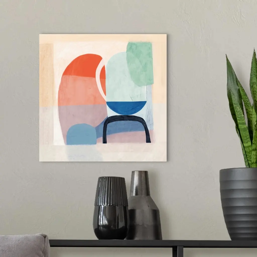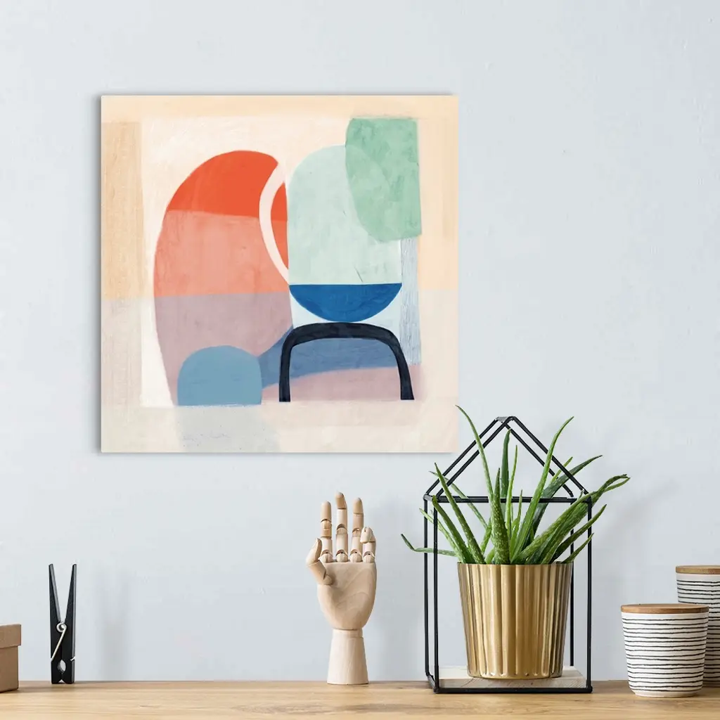 Contemporary artwork of mod shapes in pastel colors on a neutral background.