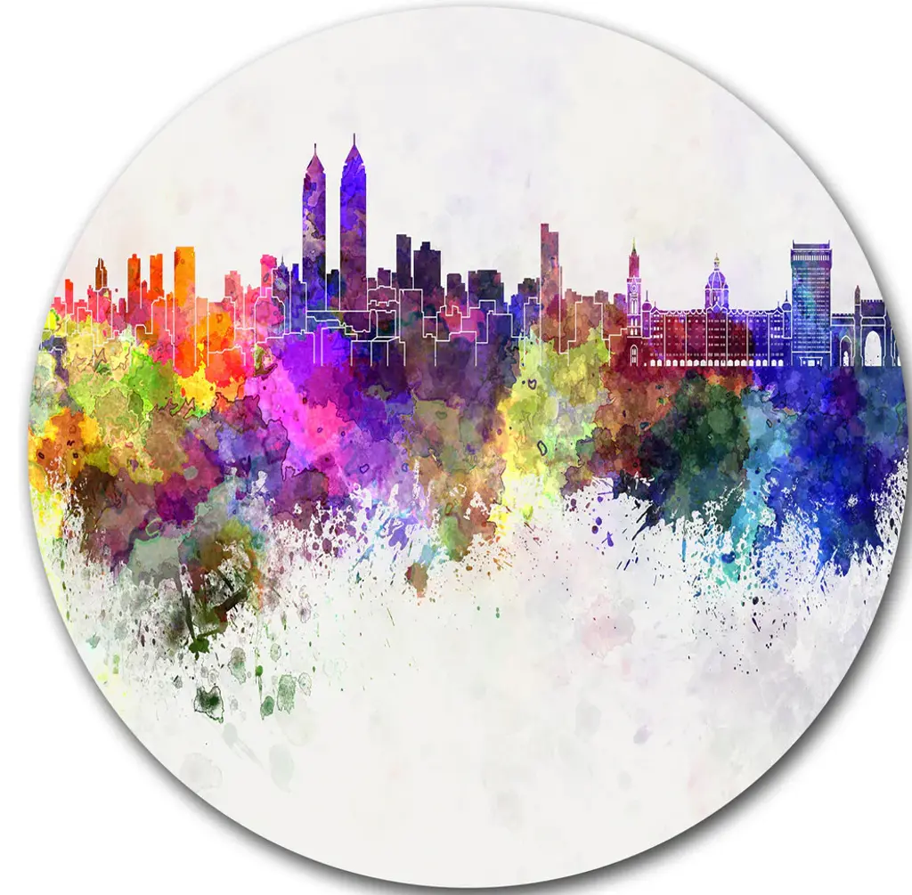 Bring Contemporary Abstraction to your home with this large Circle Metal wall art. This Mumbai Skyline Metal Artwork makes it the focal point of any room or office. - White Gloss Coating ensures colors are extra vibrant with light reflection.- Aluminum grade Sheet Metal with 1 inch mounting frame on the back giving the illusion that the artwork is floating on the wall..- Mounting Brackets are included along with instructions.- High Quality Digital images are created directly into a glossy aluminum panel producing a stunning and captivating print into the glossy finish of the metal.- Water, Fire and Scratch resistant HD Aluminum panels.- Looks better than any photo paper and guaranteed to last at least 20 years- Easy to clean with a microfiber cloth. Colors are far superior to regular Canvas Art. - Easy to Hang