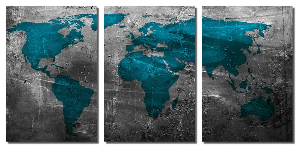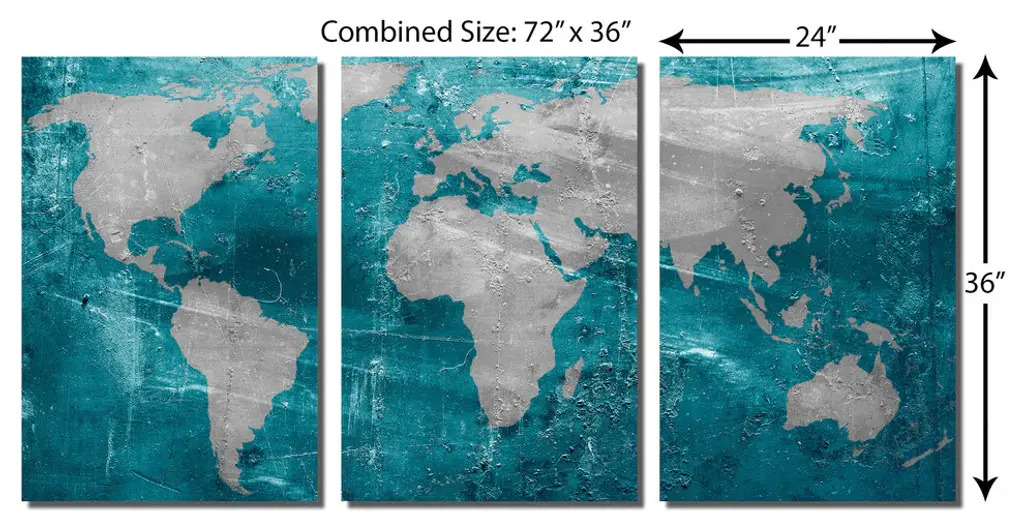72"œ x 36"œ total size. Ready To Hang! (3 pieces - 24"œ x 36"œ each). 3 Panel Split (Triptych) Abstract art World Map Metal Print ft. Munsell Blue, Teal and Gray colors. Modern metal wall art for home or office wall decor & interior design. Printed on Luxurious, HD aluminum glossy metal panels. Multi panel art.. HD aluminum panels. Metal print wall art. Includes Shadow Wall Mount on the back.• Aluminum Metal Wall Art• Made in USA• Ready to hang - No assembly required• Shadow mount hardware on the back• 0.045"œ thick HD Aluminum Panels• Scratch resistant, glossy finish• Superb color clarity, luxurious prints• Epson printing process• For indoor or moisture rich environment use• Easy to clean. Gently wipe with microfiber cloth.