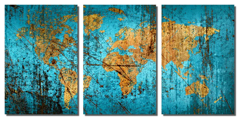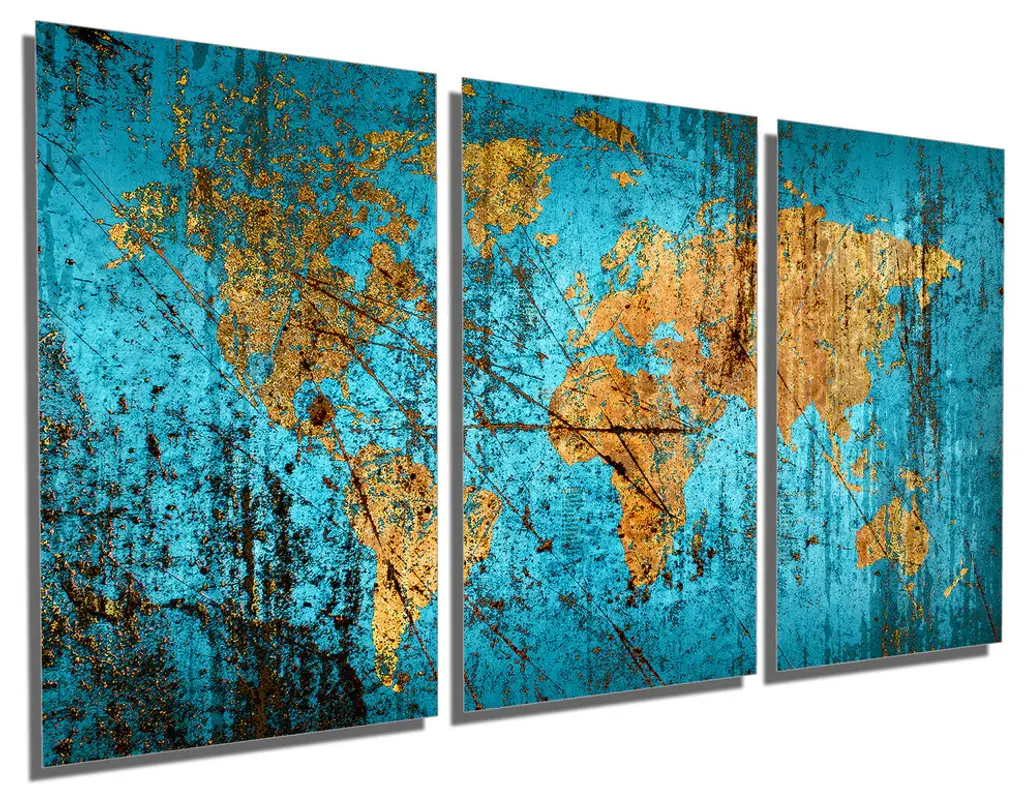 36"œ x 18"œ total size. Ready To Hang! (3 pieces - 12"œ x 18"œ each). 3 Panel Split (Triptych) Abstract World Map Metal Print art with shades of earth yellow/brown and munsell blue colors. Modern metal wall art for home or office wall decor & interior design. Printed on Luxurious, HD aluminum glossy metal panels.. HD aluminum panels. Metal print wall art. Includes Shadow Wall Mount on the back.• Aluminum Metal Wall Art• Made in USA• Ready to hang - No assembly required• Shadow mount hardware on the back• 0.045"œ thick HD Aluminum Panels• Scratch resistant, glossy finish• Superb color clarity, luxurious prints• Epson printing process• For indoor or moisture rich environment use• Easy to clean. Gently wipe with microfiber cloth.