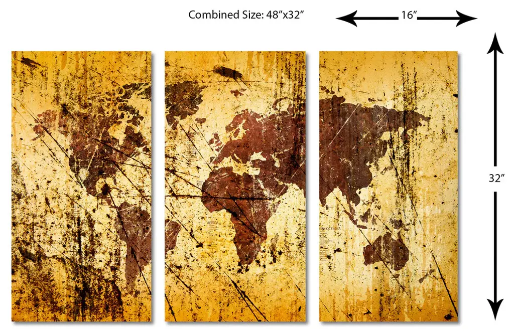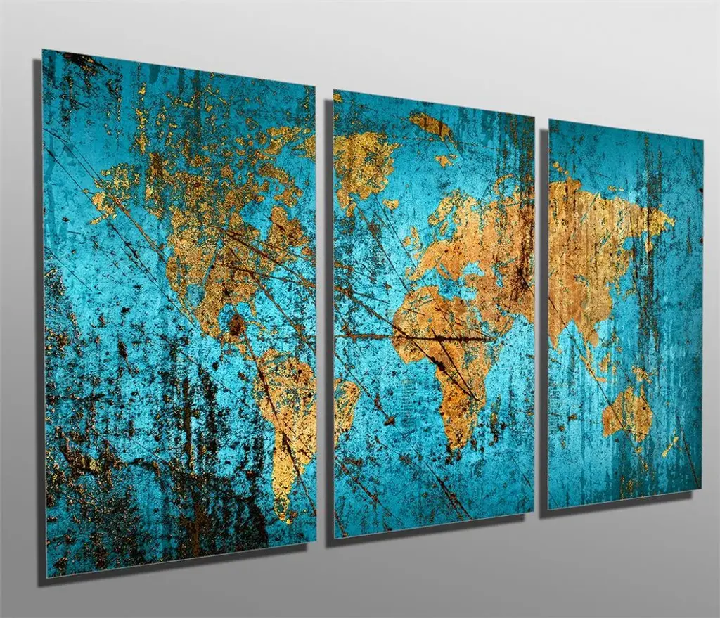 48"œ x 24"œ total size. Ready To Hang! (3 pieces - 16"œ x 24"œ each). 3 Panel Split (Triptych) Abstract World Map Metal Print art with shades of earth yellow/brown and munsell blue colors. Modern metal wall art for home or office wall decor & interior design. Printed on Luxurious, HD aluminum glossy metal panels.. HD aluminum panels. Metal print wall art. Includes Shadow Wall Mount on the back.• Aluminum Metal Wall Art• Made in USA• Ready to hang - No assembly required• Shadow mount hardware on the back• 0.045"œ thick HD Aluminum Panels• Scratch resistant, glossy finish• Superb color clarity, luxurious prints• Epson printing process• For indoor or moisture rich environment use• Easy to clean. Gently wipe with microfiber cloth.