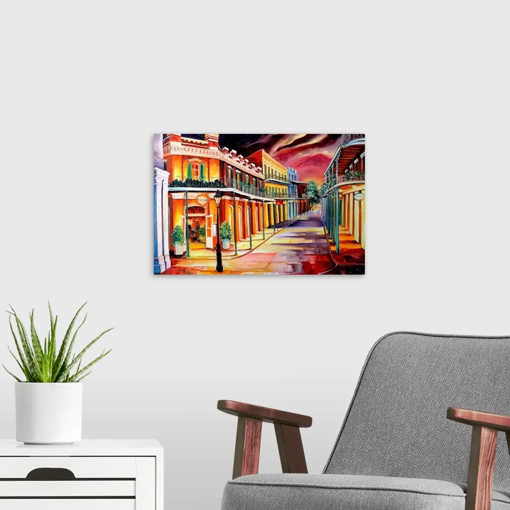 This is a contemporary painting of an urban cityscape depicting this national historic landmark neighborhood in New Orleans. The painting uses an expressionist style to simplify the scene, the intense clouds above, and the vibrant nighttime colors illuminating the street.